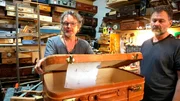Ein Paravent für KatzenRentner Bernd Sombrowski (r) nimmt Abschied von seinem alten 20er Jahre Drogerieschrank, Restauratorin Marion Gerhards nimmt sich ihm zusammen mit Moderator Oli P. (m) an.Bild: © WDR/Encanto Film- und Fernsehproduktions GmbH
