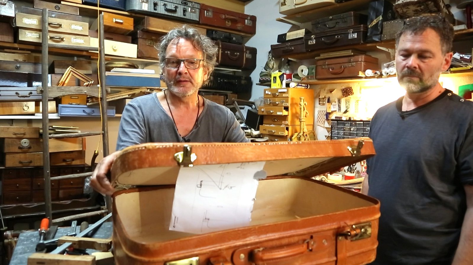 O'zapft is!Die Koffer-Experten Dominikus Probst (l) und Laurenz Buchholz haben mit einem alten Reisekoffer zu kämpfen.Bild: © WDR/Encanto Film- und Fernsehproduktions GmbH