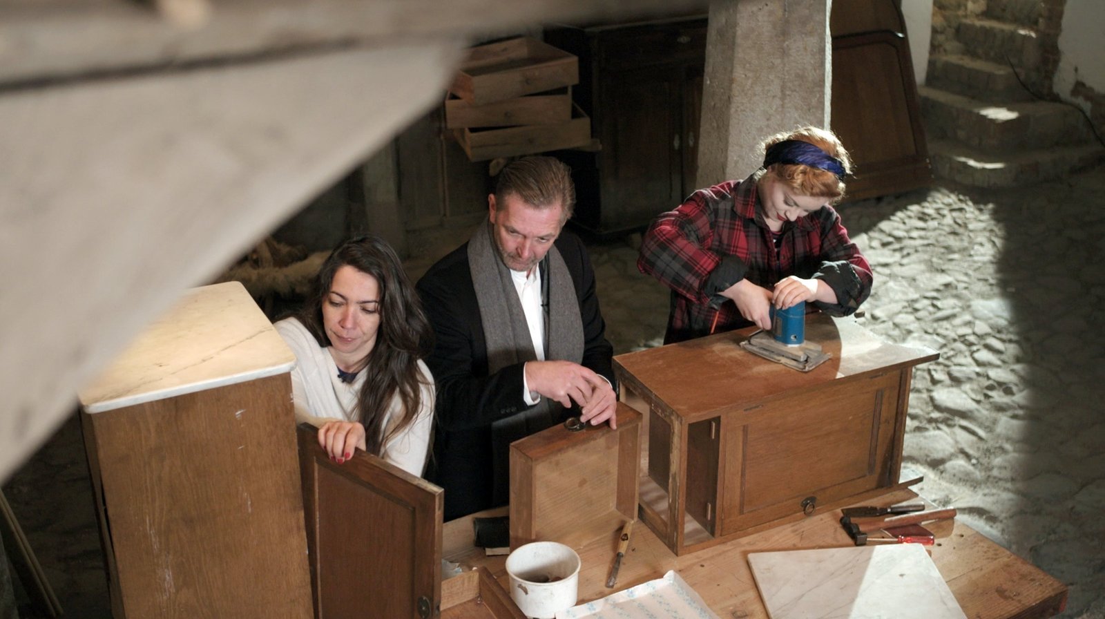 Die automatische VitrineDie Holzexperten Marcela Holzhausen (l) und Heiko Wussow (m) bauen zusammen mit Victoria zwei alte Nachtschränkchen um.Bild: © WDR/Encanto Film- und Fernsehproduktions GmbH