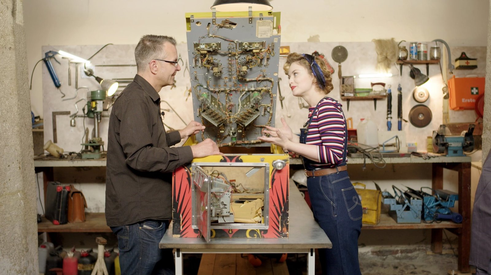 Ein Holzbett wird zur SitzbankFlipper-Experte Henrick untersucht zusammen mit Victoria Beyer das Innenleben des alten Flippers.Bild: © WDR/Encanto Film- und Fernsehproduktions GmbH