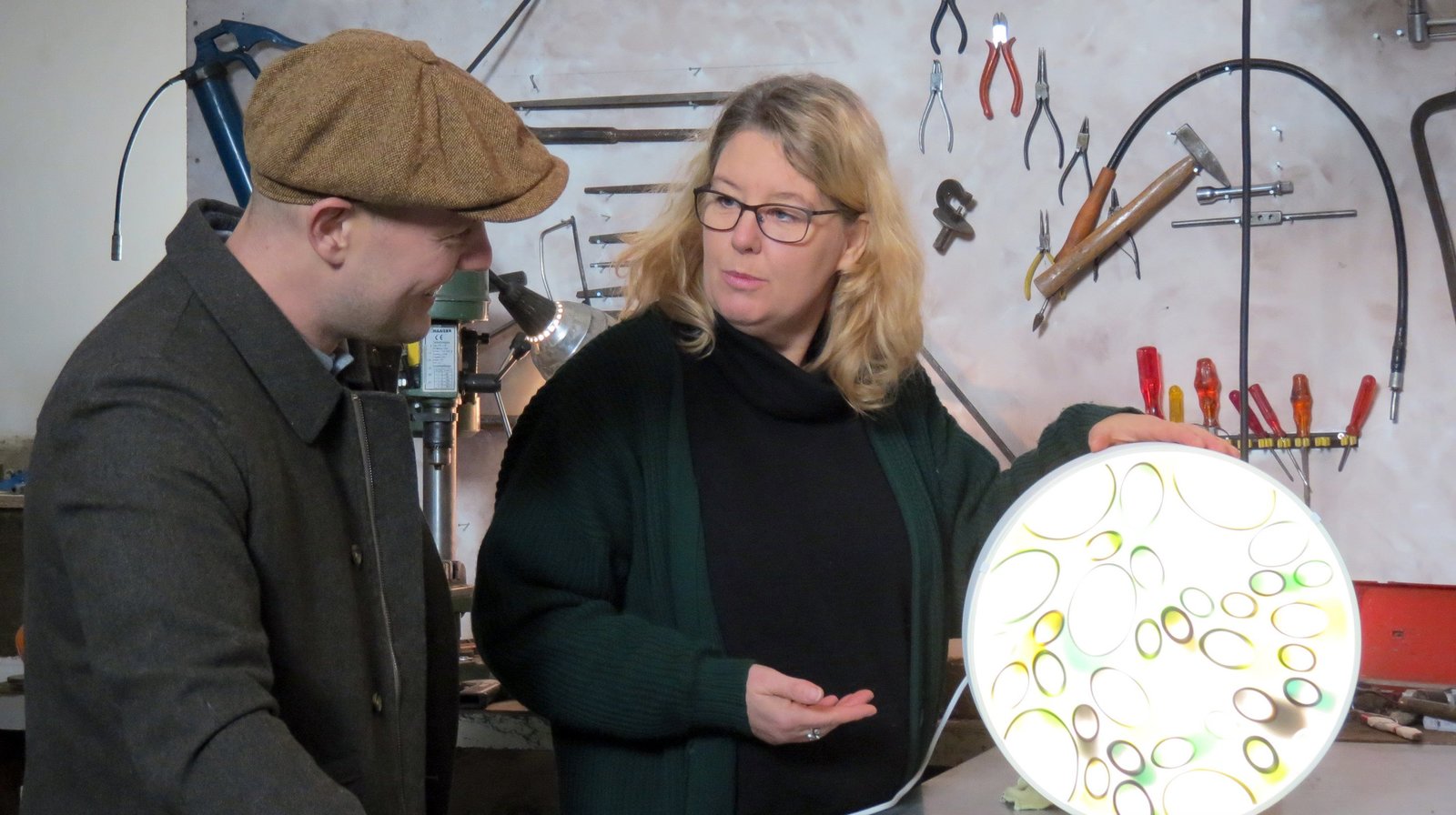Die FlaschenlampeExpertin Sybille Homann demonstriert Oli die Wandleuchte aus alten Weinflaschen.Bild: © WDR/Encanto Film- und Fernsehproduktions GmbH