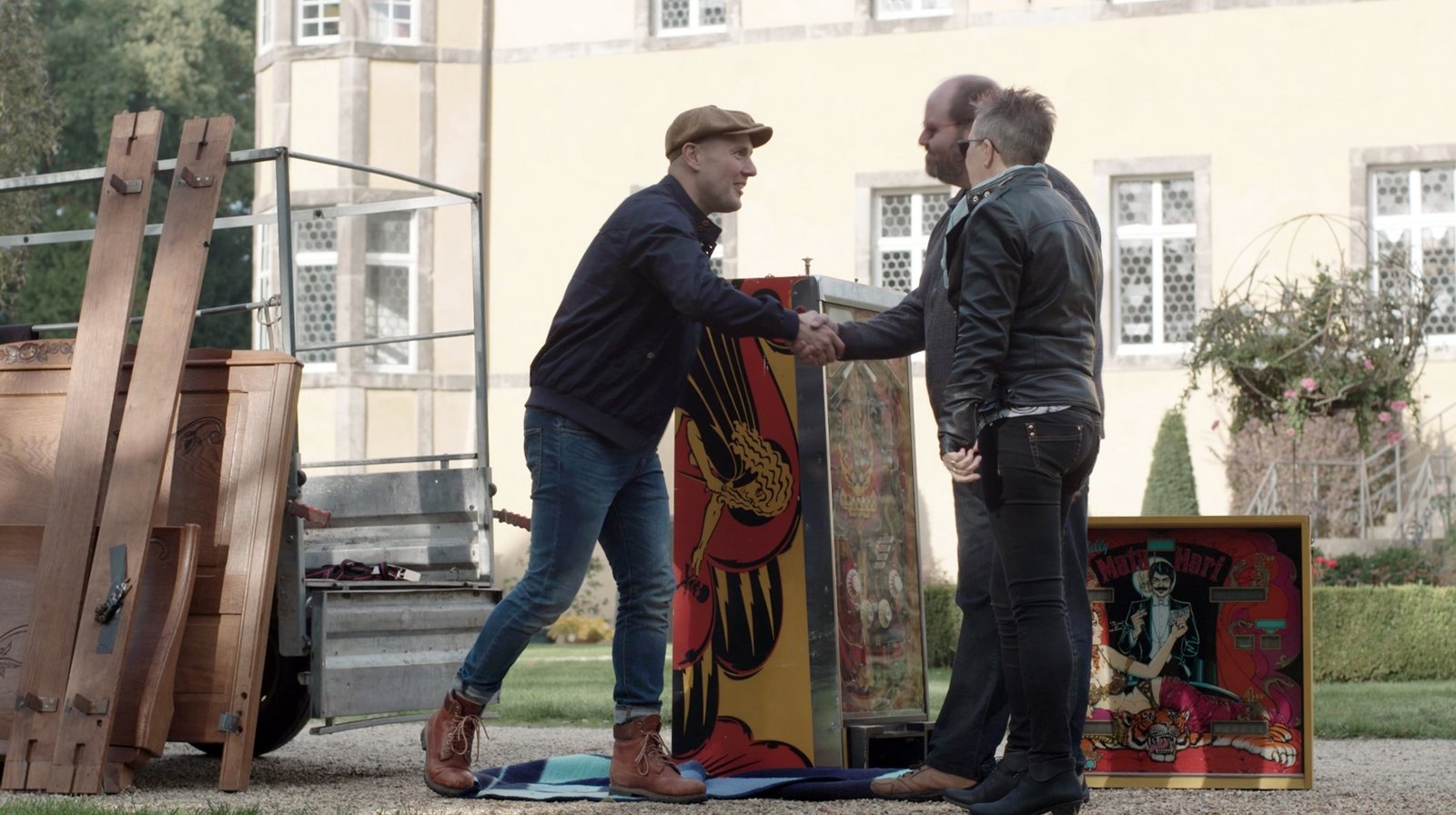 Ein Holzbett wird zur SitzbankModerator Oliver Petszokat (l) freut sich über einen Flipper und ein altes Bett, das Jean-Louis und Ursula auf die Burg bringen. In jeder Folge von "Hallo Schatz" rettet Oli P. mit der Kunsthistorikerin Victoria Beyer alten Krempel, der sich auf Deutschlands Dachböden, in Kellern oder Garagen staut und stapelt, und den ihre Besitzer zum "Hallo Schatz"-Domizil auf Burg Adendorf bringen - ein wahrlich magischer Ort, wo vergessene Dinge wieder zu neuem Leben erweckt werden.Bild: © WDR/Encanto Film- und Fernsehproduktions GmbH