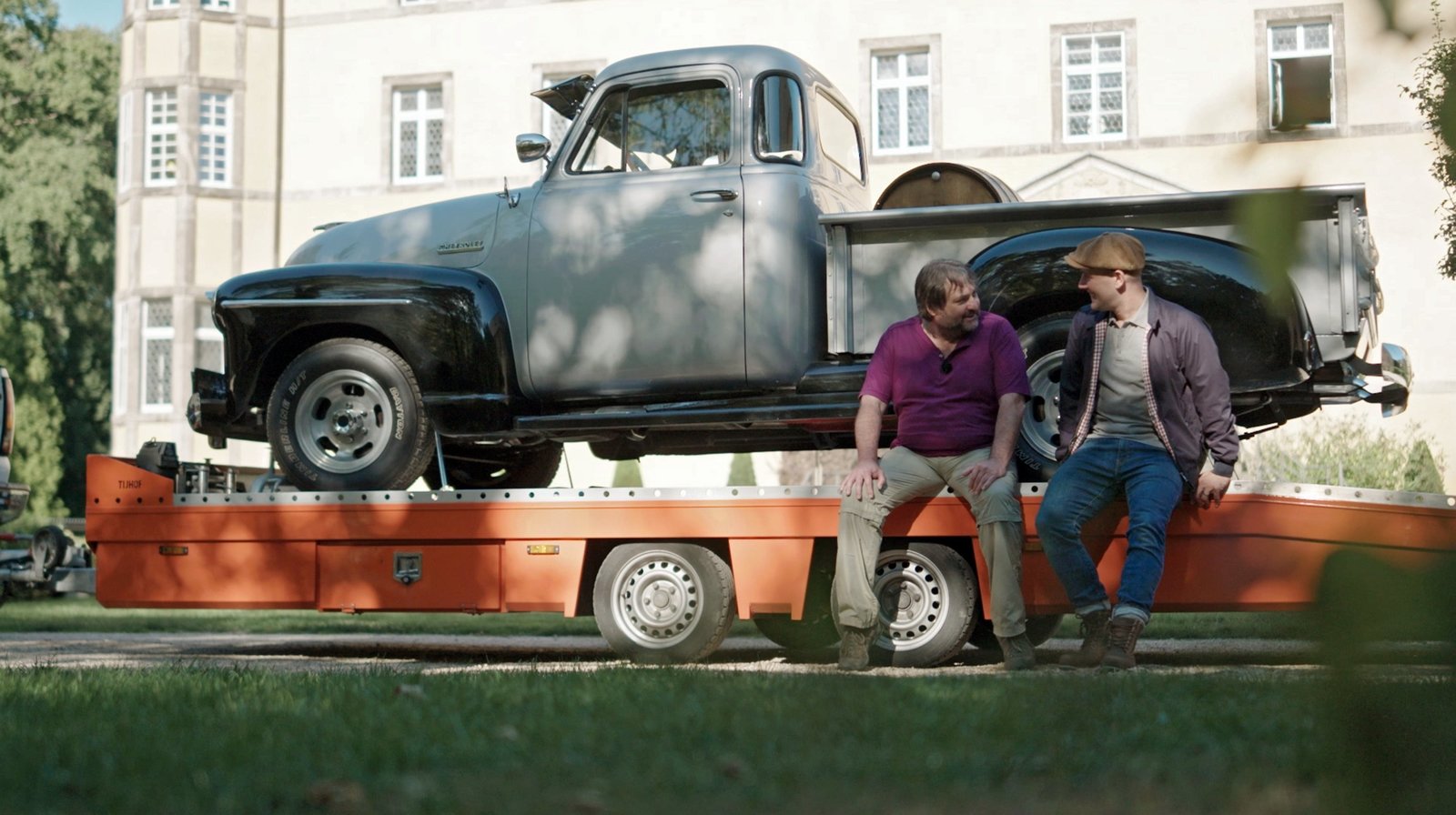 Ein Pickup zum VerliebenHeute bekommt Oli P. (r) einen ganz besonderen Schatz: Dietmar bringt seinen alten Chevrolet Baujahr 1959 auf die Burg.Bild: © WDR/Encanto Film- und Fernsehproduktions GmbH