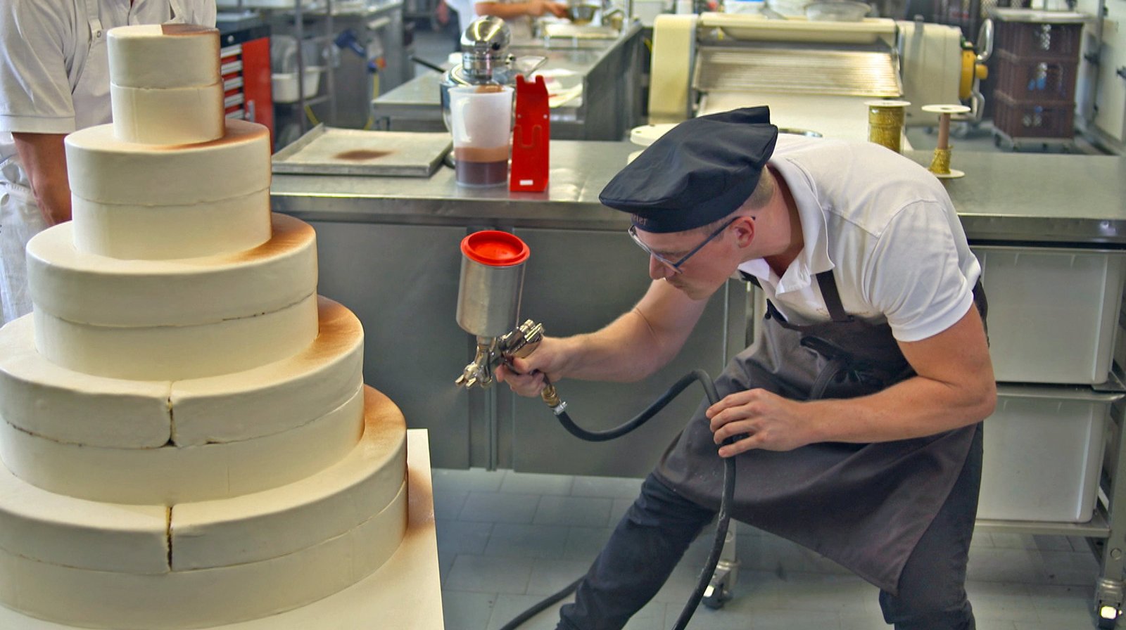 Wie man eine Hochzeitstorte backtBevor die Hochzeitstorte "New English Classic" dekoriert wird, sprüht Konditormeister Christian Böckeler eine Hälfte mit dunkler Kuvertüre ein.Bild: © BR/SWR