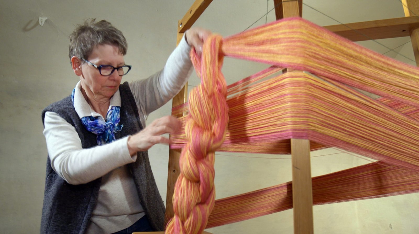 Wie man Stoff webtMargarete Horle bildet mit den Stoffschnüren einen Kettzopf.Bild: © SWR