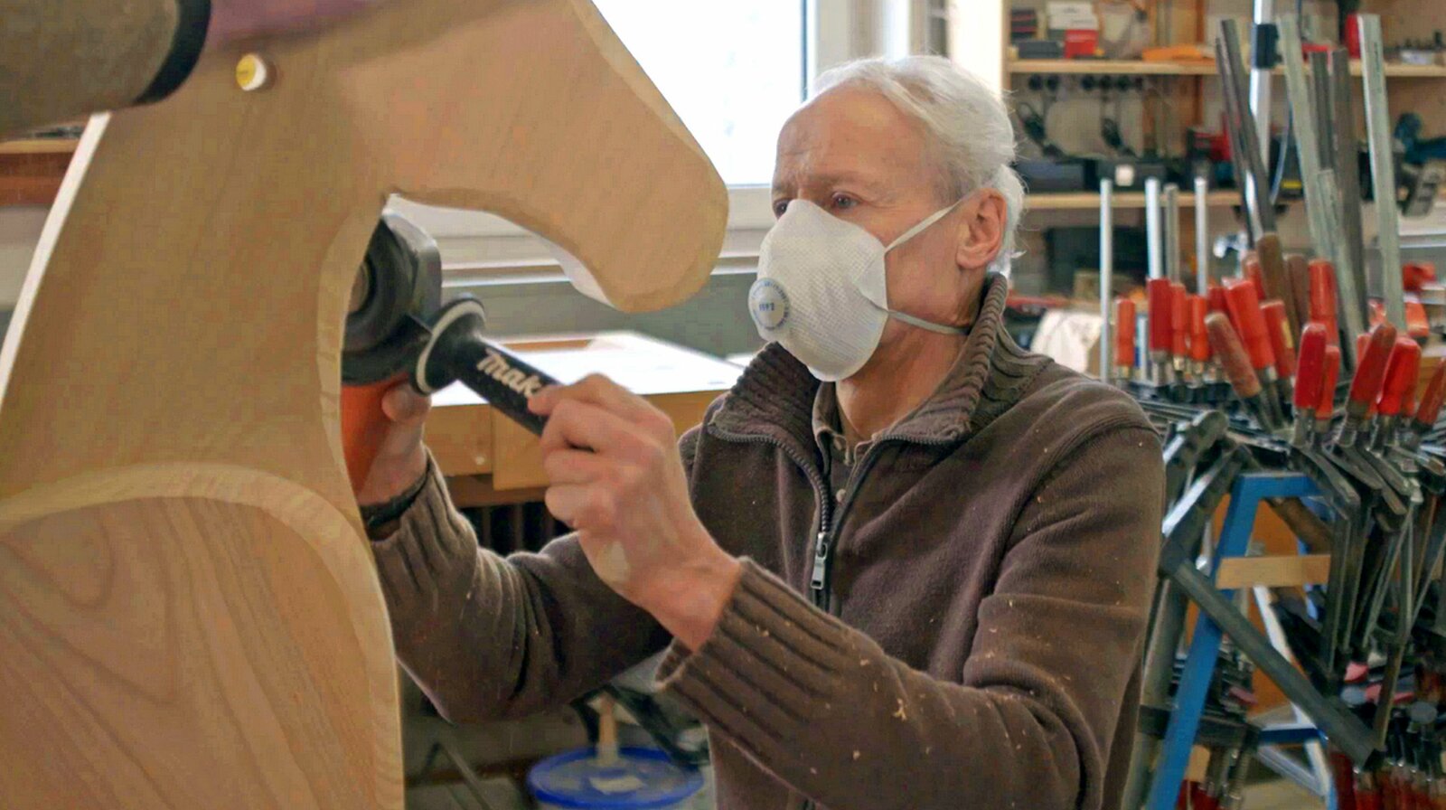 Wie man ein Schaukelpferd bautMit dem Schwingschleifer rückt Peter Hais dem Schaukelpferd zu Leibe. Das Pferd bekommt seinen eigenen Charakter.Bild: © BR/SWR