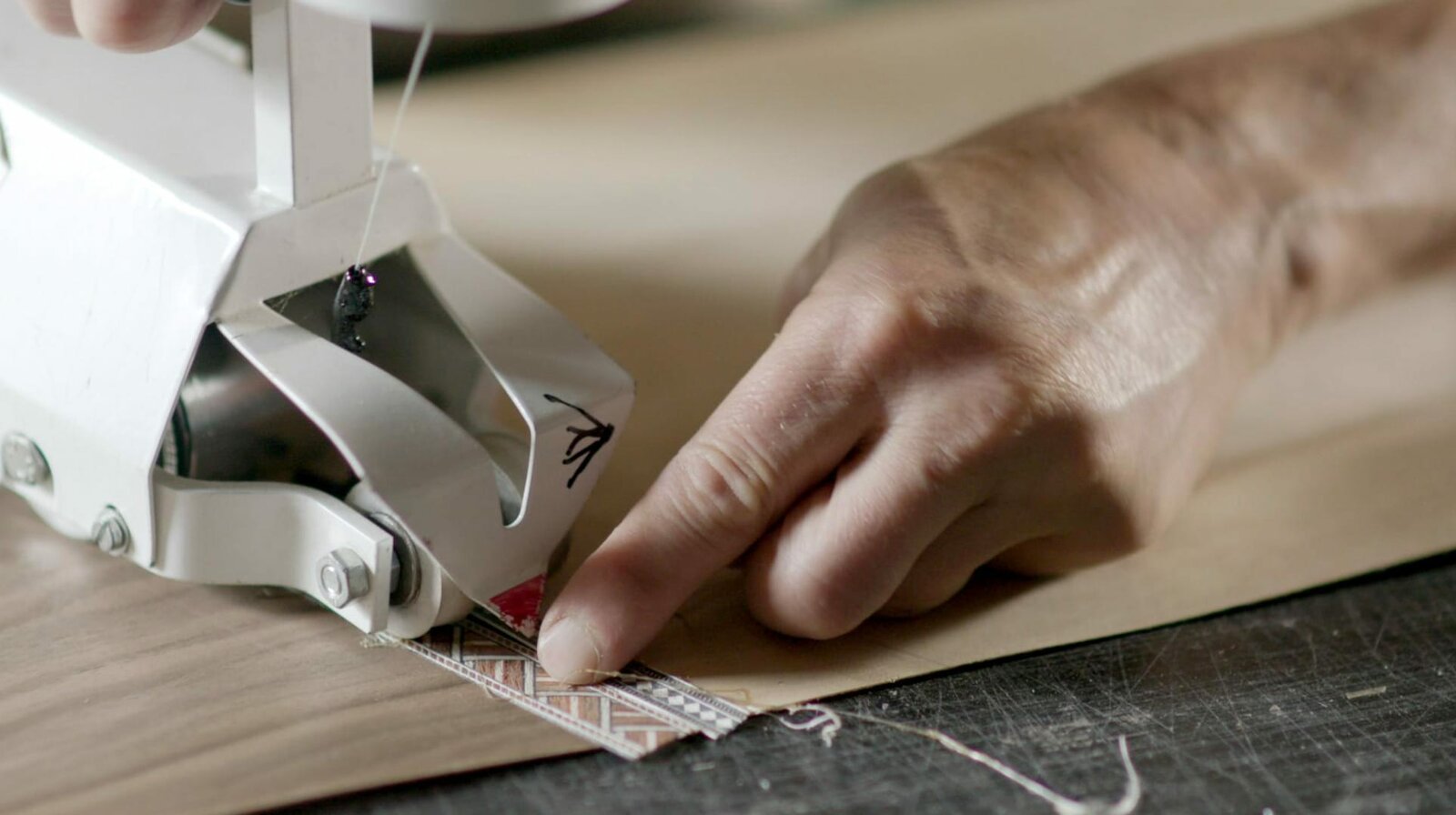 Wie man ein Surfskate bautMit der Furniernähmaschine setzt Martin Sammet die Echtholzteile zu einem zusammen, das ist später die Unterseite des Boards.Bild: © SWR