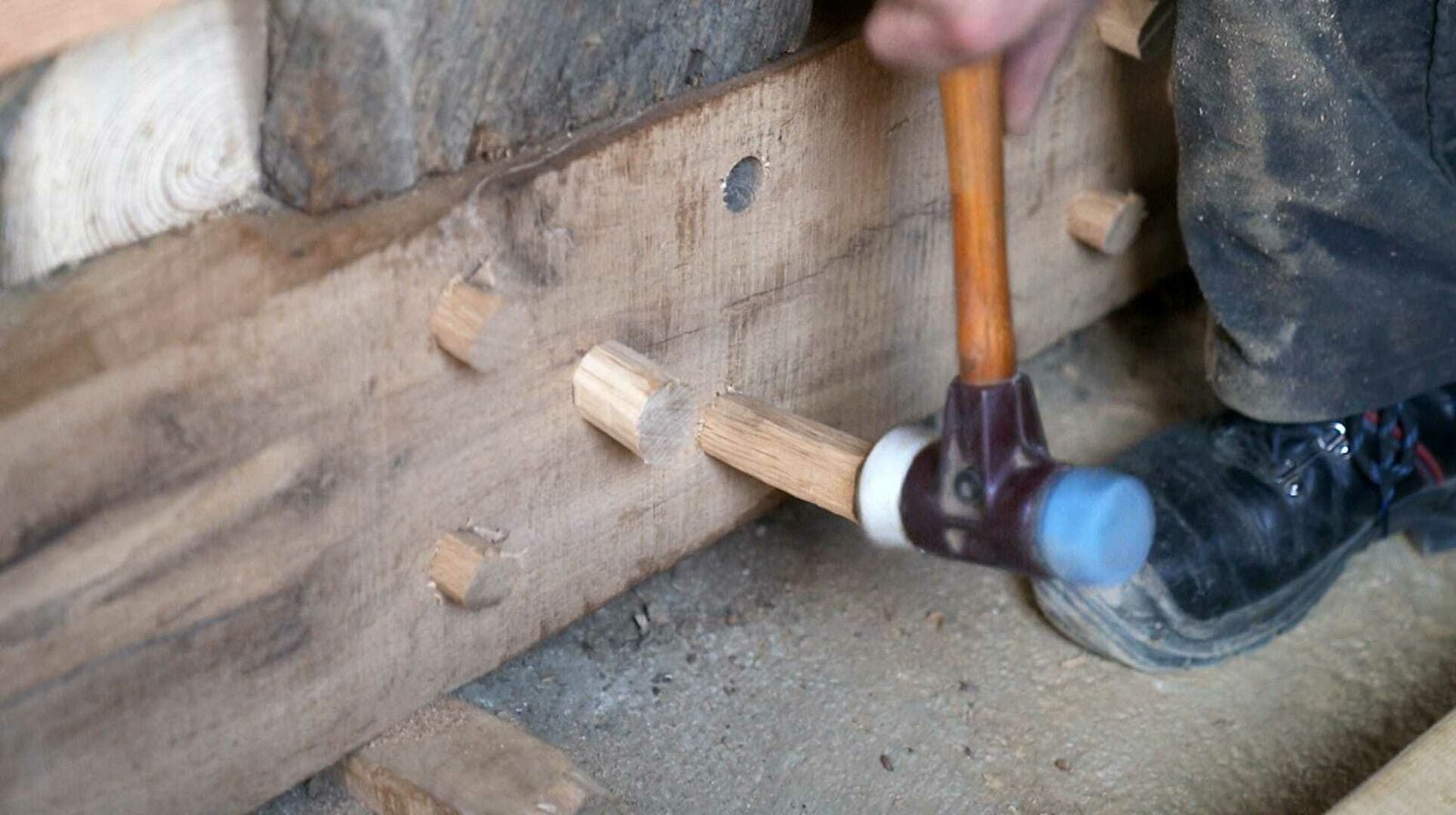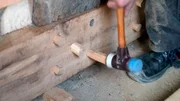 Wie man Fachwerk restauriertZur Fixierung des neuen Balkens im bestehenden Fachwerk benutzt der Zimmermann Holzdübel.Bild: © SWR
