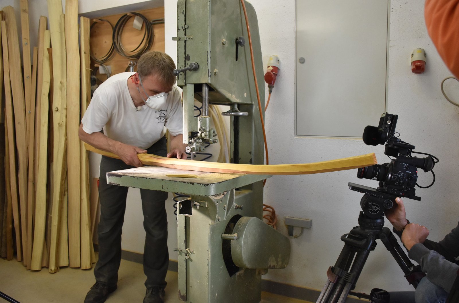 Wie man einen Recurvebogen bautMit der Bandsäge wird der Rohling zurechtgestutzt.Bild: © SWR