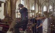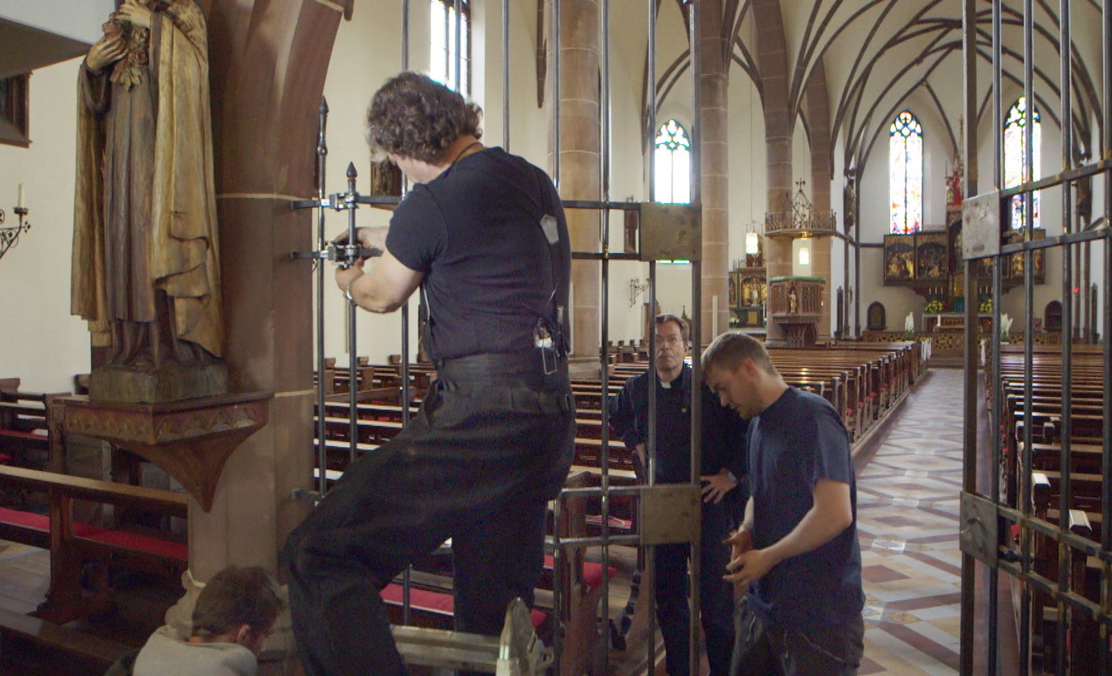 Wie schwer es ist, ein Tor zu schmiedenSchmied Thomas-Maria Schmidt (vorne im Bild) beim Einbauen des fertigen Tores in der katholischen Kirche in Contwig (Pfalz).Bild: © SWR