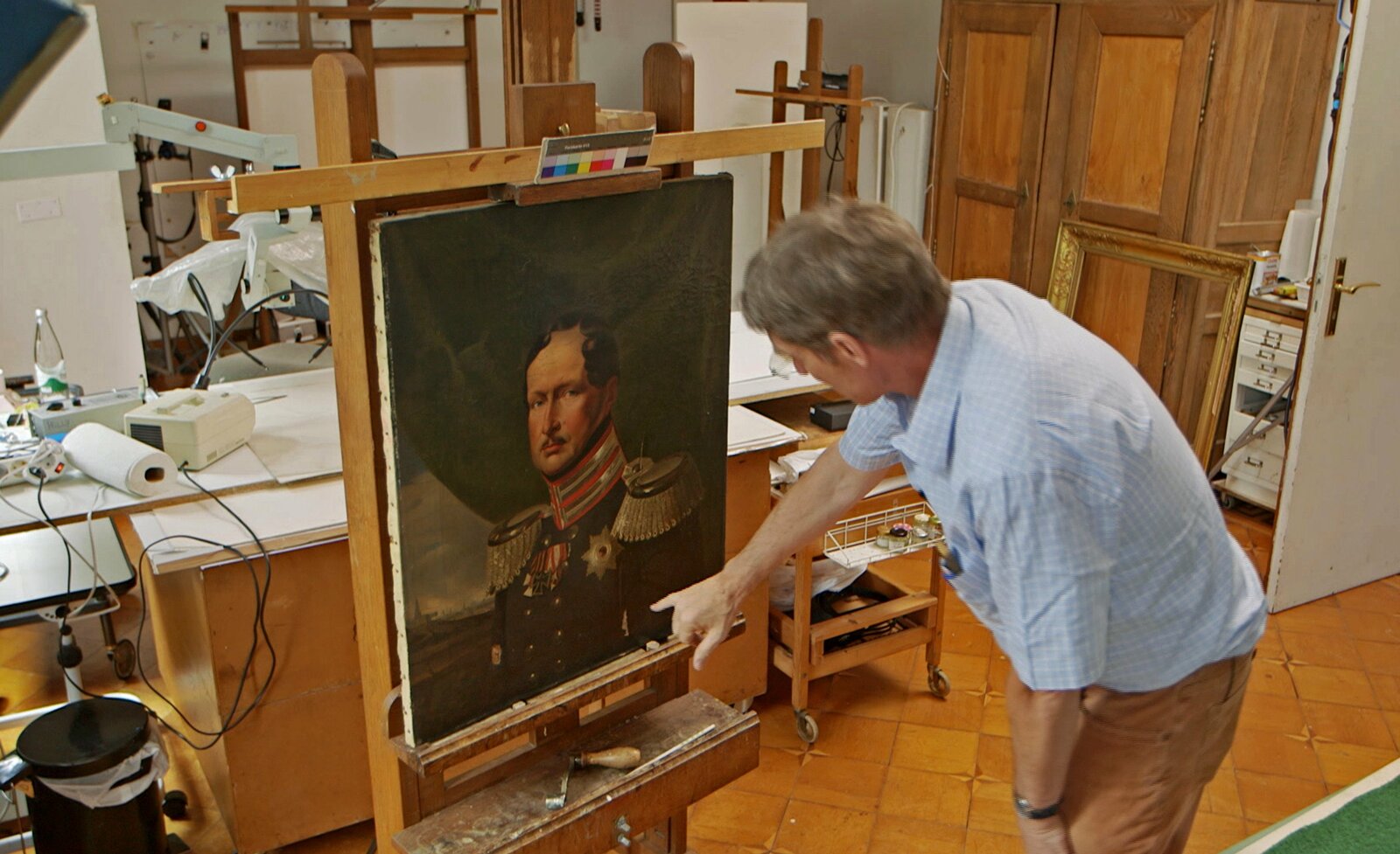 Wie man ein Gemälde restauriertRestaurator Tilman Holly aus Kruft in der Eifel bei der Bestandsaufnahme der Schäden am Gemälde Friedrich Wilhelm IV. von Preußen.Bild: © BR/SWR