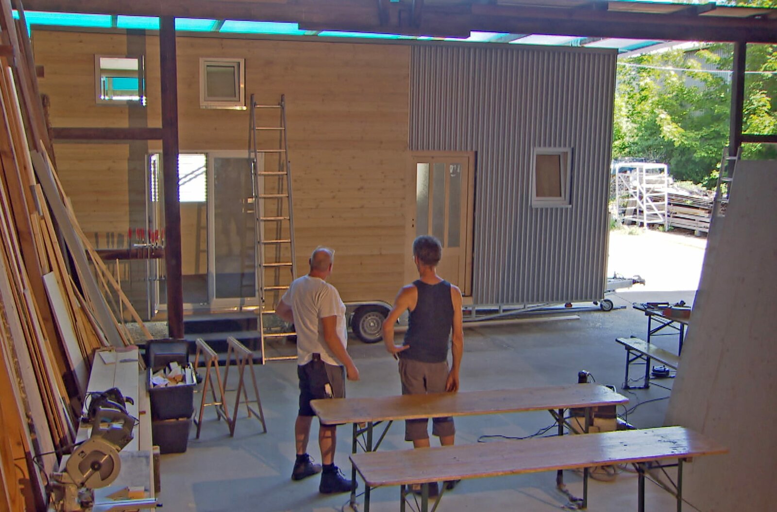 Wie man ein Tiny House bautChristian Kienel (links) baut jedes Tiny House nach den Wünschen seines Kunden/Auftraggebers: Bauherr Matthias Eitel (rechts) entschied sich für eine Kombination aus Holz und Aluminium.Bild: © BR/SWR