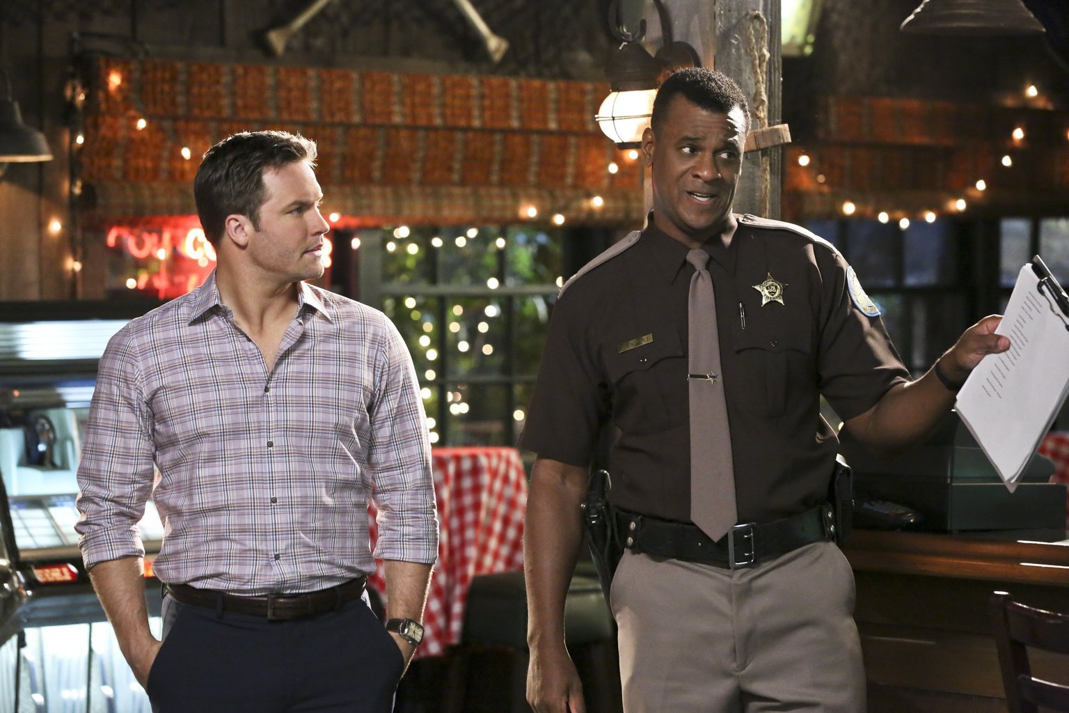 Shelby ist unschlagbarNachdem Shelby aus mysteriösen Gründen ihren Auftritt abbrechen muss, ermittelt Sheriff Bill (John Eric Bentley, r.) in alle Richtungen, doch Anwalt George (Scott Porter, l.) macht es ihm nicht leicht ...Bild: © 2014 Warner Brothers Lizenzbild frei