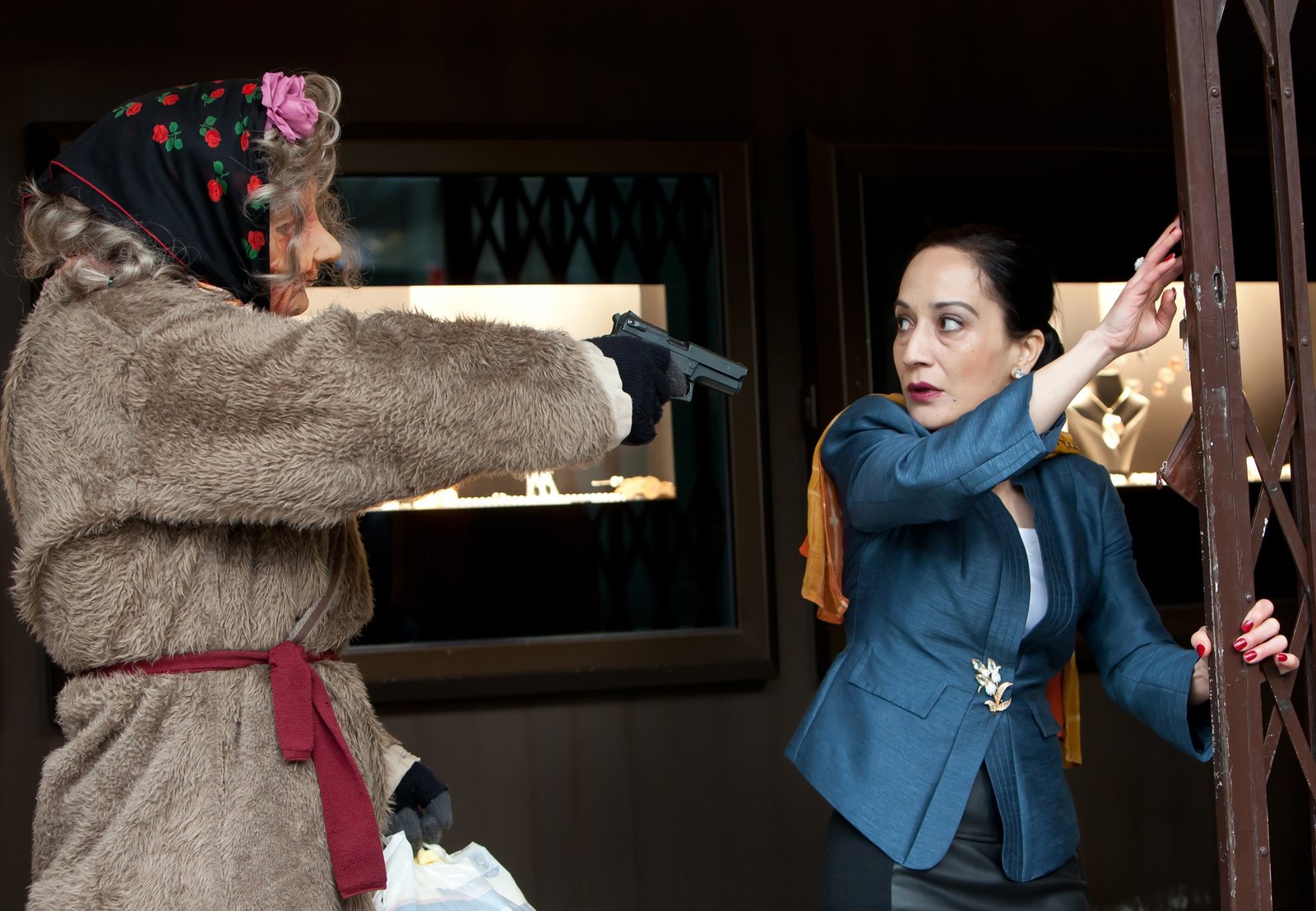 Die RäuberARD HEITER BIS TÖDLICH - HAUPTSTADTREVIER, FOLGE 32, "Die Räuber", am Dienstag (11.11.14) um 18:50 Uhr im ERSTEN. In Berlin wird am hellichten Tag ein Juweliergeschäft überfallen. Die schockierte Verkäuferin Yazmina Tarzi (Fatma Genc, r.) wird von einem maskierten Täter (Komparse) in Frauenkleidern mit einer Waffe bedroht.Bild: © ARD/Daniela Incoronato