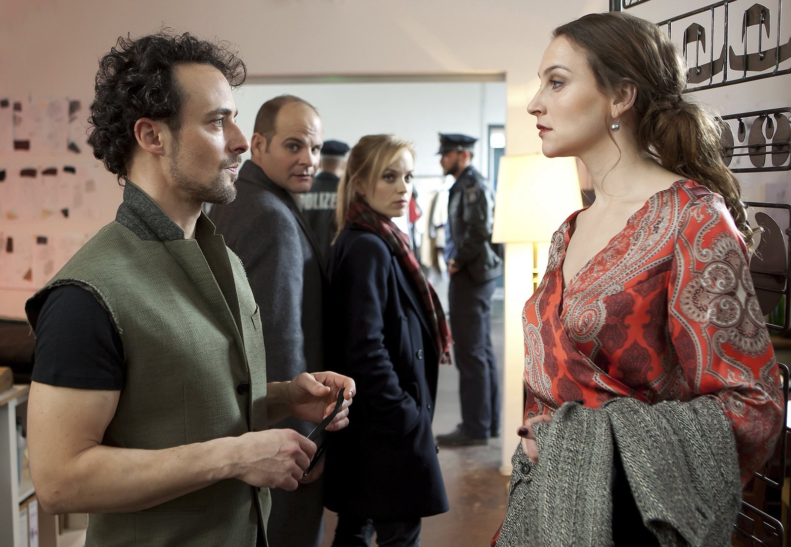 Fashion VictimARD HEITER BIS TÖDLICH - HAUPTSTADTREVIER, FOLGE 29, "Fashion Victim", am Dienstag (21.10.14) um 18:50 Uhr im ERSTEN. Der völlig aufgelöste René Friedmann (Sascha Tschorn, l.) alarmiert die Polizei, weil er zu wissen glaubt, dass seine Chefin Felia Nieritz (Jana Klinge, r.) ermordet wurde. Doch die steht kurz darauf quicklebendig in ihrem Atelier. Ihr Tod war nur eine Vision. Julia Klug (Fiederike Kempter, M.) und Johannes Sonntag (Matthias Klimsa, 2.v.l.) ziehen erleichtert wieder ab (mit Komparse).Bild: © ARD/Daniela Incoronato