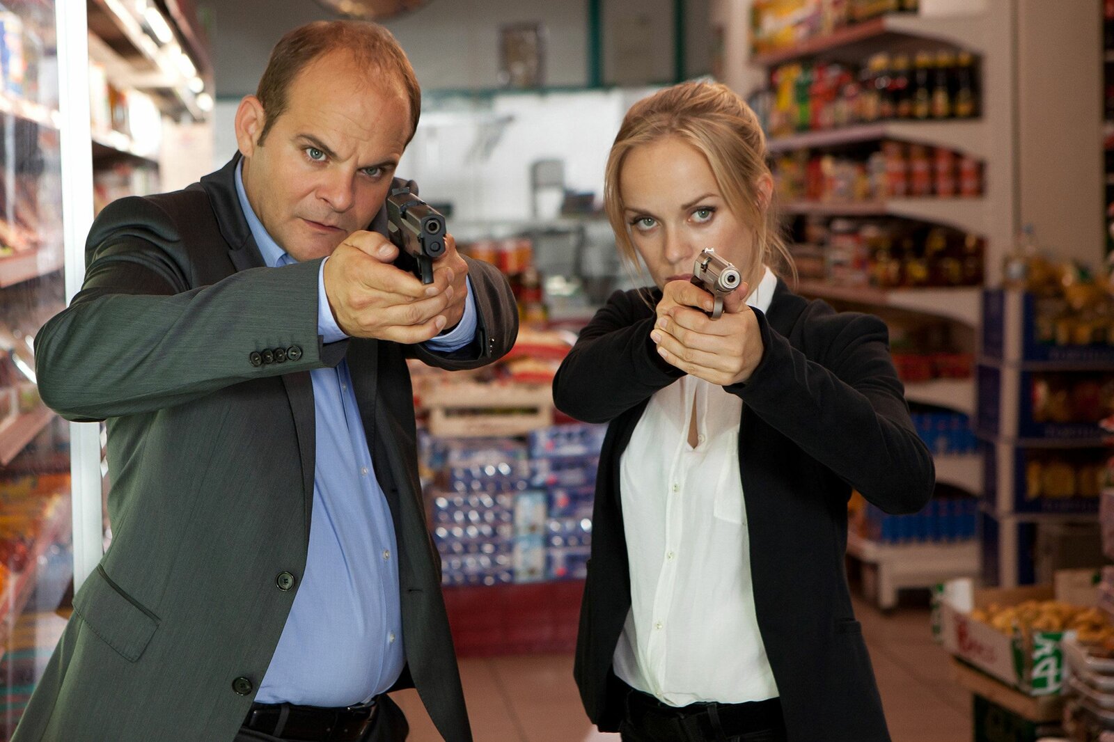 So Gott willARD HEITER BIS TÖDLICH - HAUPTSTADTREVIER, FOLGE 20, "So Gott will", am Dienstag (04.02.14) um 18:50 Uhr im ERSTEN. Entführung: Julia Klug (Friederike Kempter, r.) und Johannes Sonntag (Matthias Klimsa, l.) mit gezückter Pistole.Bild: © ARD/Daniela Incoronato