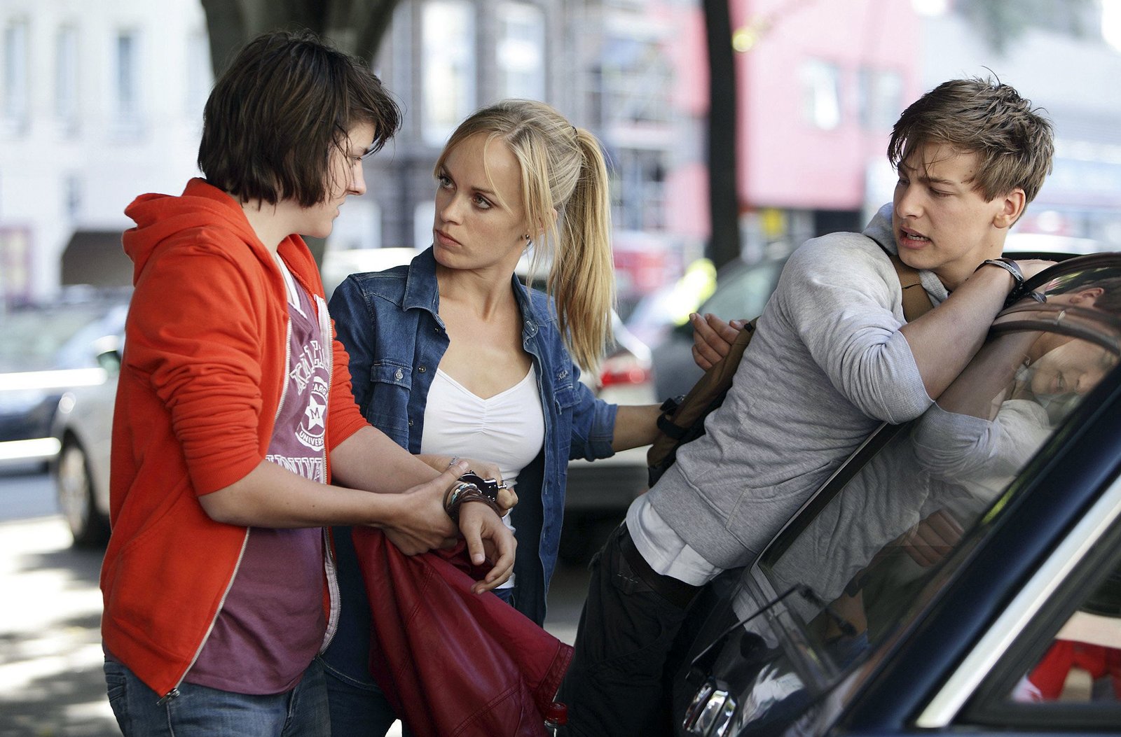 Der VormundNDR Fernsehen HEITER BIS TÖDLICH: HAUPTSTADTREVIER, "Der Vormund", am Samstag (21.03.15) um 16:45 Uhr. Julia Klug (Friederike Kempter, M.) erwischt Nele (Luzie Ahrens, l.) und Marc Wagner (Timmi Trinks, r.), als die beiden gerade ihr Auto ausräumen wollen.Bild: © NDR/ARD/Daniela Incoronato