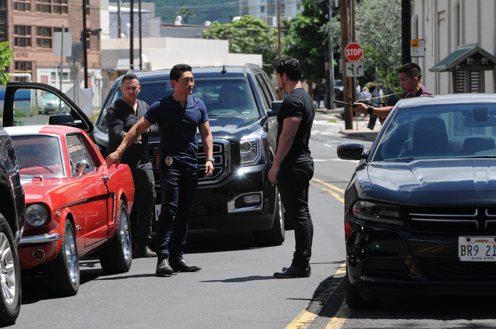 "Ka Papahana Holo Pono" -- Five-0 investigates when a wealthy recluse is found dead in a remote field with nearly one million dollars in counterfeit bills. Also, Adam is kidnapped by the Yakuza and forced to torture one of Gabriel\'s men, on HAWAII FIVE-0, Friday, Oct. 16 (9:00-10:00 PM, ET/PT), on the CBS Television Network. Football legend Jerry Rice guest stars as himself. (*"Ka Papahana Holo Pono" is Hawaiian for "Best Laid Plans") From left, Chin Ho Kelly (Daniel Dae Kim), Captain Lou Grover (Chi McBride) and Steve McGarrett (Alex O\'Loughlin), shown. Photo: Norman Shapiro/CBS �©2015 CBS Broadcasting, Inc. All Rights Reserved