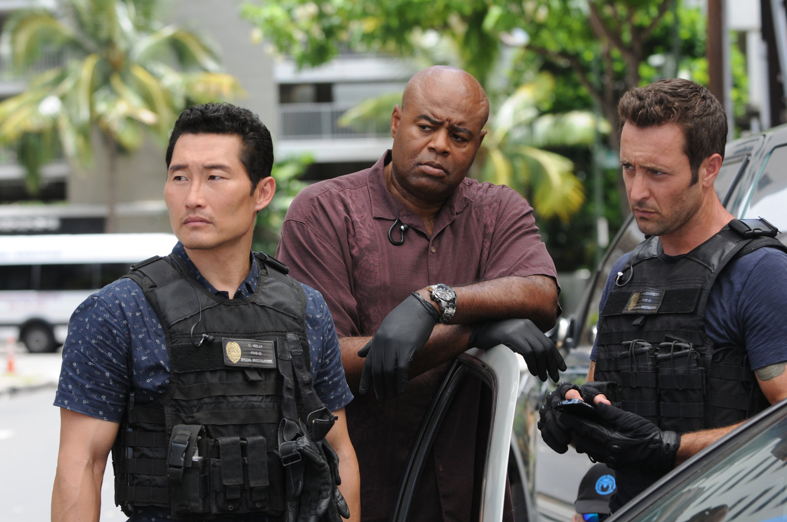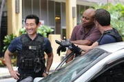 (L-R) Chi McBride las Lou Grover, Grace Park als Kono Kalakaua und Daniel Dae Kim als Chin Ho Kelly