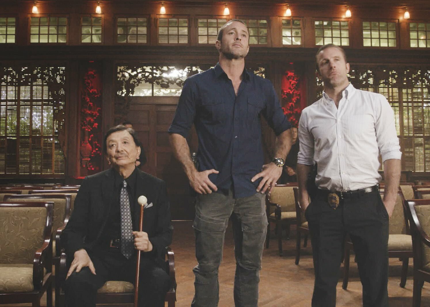 Ein Chef der Triaden, Jin Leung (James Hong, l.), unterstützt Steve McGarrett (Alex O'Loughlin, M.) und Danny Williams (Scott Caan, r.). Doch können sie diesem Ganoven vertrauen?