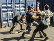 Die verlorenen HändeAls ein Motorrad-Polizist von einem Scharfschützen erschossen wird, während er einen Konvoi begleitet, werden Steve (Alex O'Loughlin, l.), Danny (Scott Caan, 2.v.l.), Chin (Daniel Dae Kim, 2.v.r.) und Kono (Grace Park, r.) damit beauftragt, den Täter zu fassen ...Bild: © kabel eins