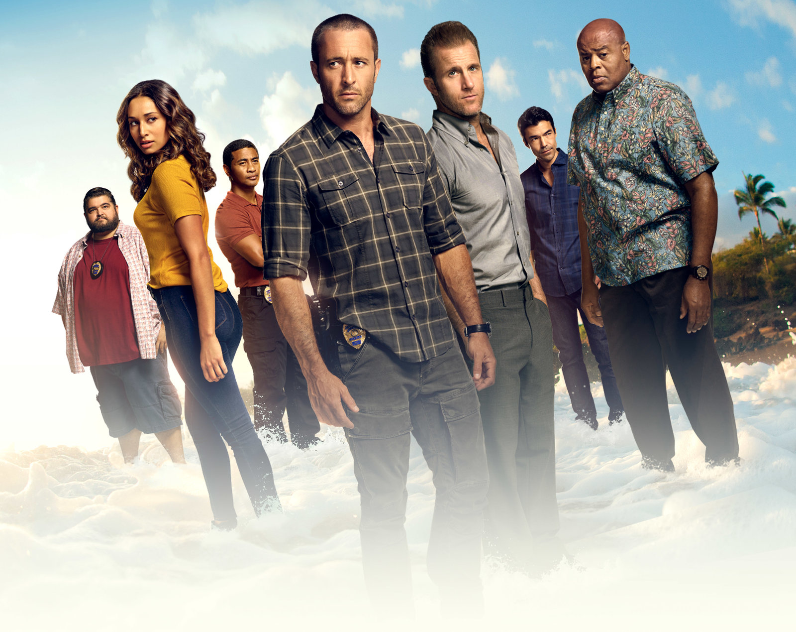 (8. Staffel) - Kämpfen gegen das organisierte Verbrechen auf Hawaii: Steve McGarrett (Alex O'Loughlin, M.), Danny Williams (Scott Caan, 3.v.r.), Adam Noshimuri (Ian Anthony Dale, 2.v.r.), Lou Grover (Chi McBride, r.), Jerry Ortega (Jorge Garcia, l.), Tani Rey (Meaghan Rath, 2.v.l.) und Junior Reigns (Beulah Koale, 3.v.r.).Bild: © RTS/CBS