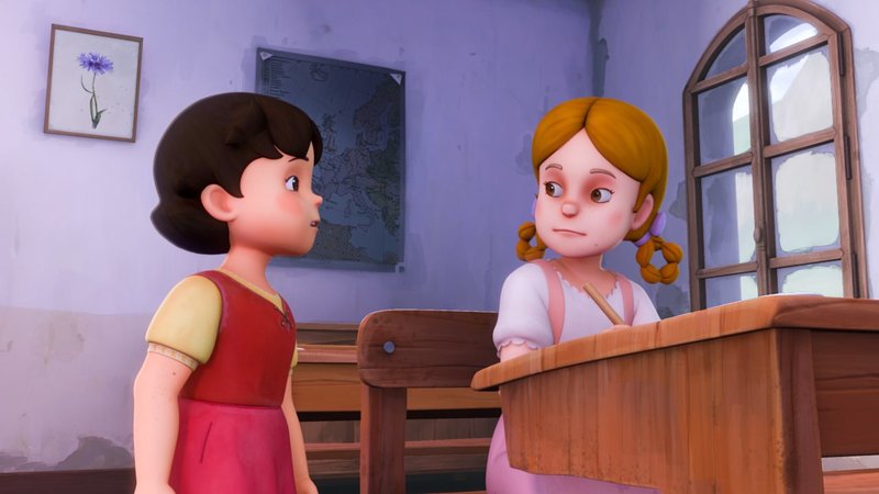 Heidis erste SchulstundeGroßmama unterbricht Herrn Bahners Unterricht, um mit Heidi zu reden.Bild: © ZDF/Studio 100 Animation/Heidi Productions Pty. Limited