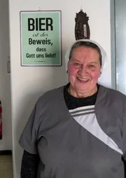 Folge 1Nonne Doris Engelhard (69) vor Schild mit der Aufschrift "Bier ist der Beweis, dass Gott uns liebt!".Bild: © BR/south & browse GmbH/Sebastian Krüger / Sebastian Krüger
