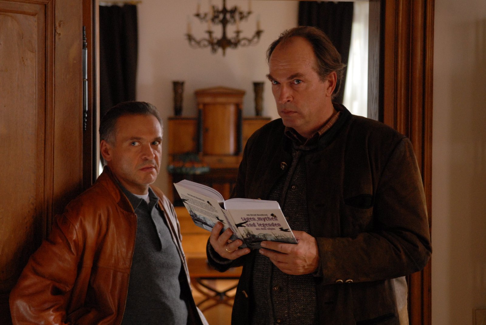 Erntedank - Ein AllgäukrimiDurchsuchung bei Richter Hartmann. Das vorgefundene Sagenbuch wirft für die Kommissare Kluftinger (Herbert Knaup, rechts) und Hefele (Jockel Tschiersch, links) neue Fragen auf.Bild: © Heimatkanal (DE)
