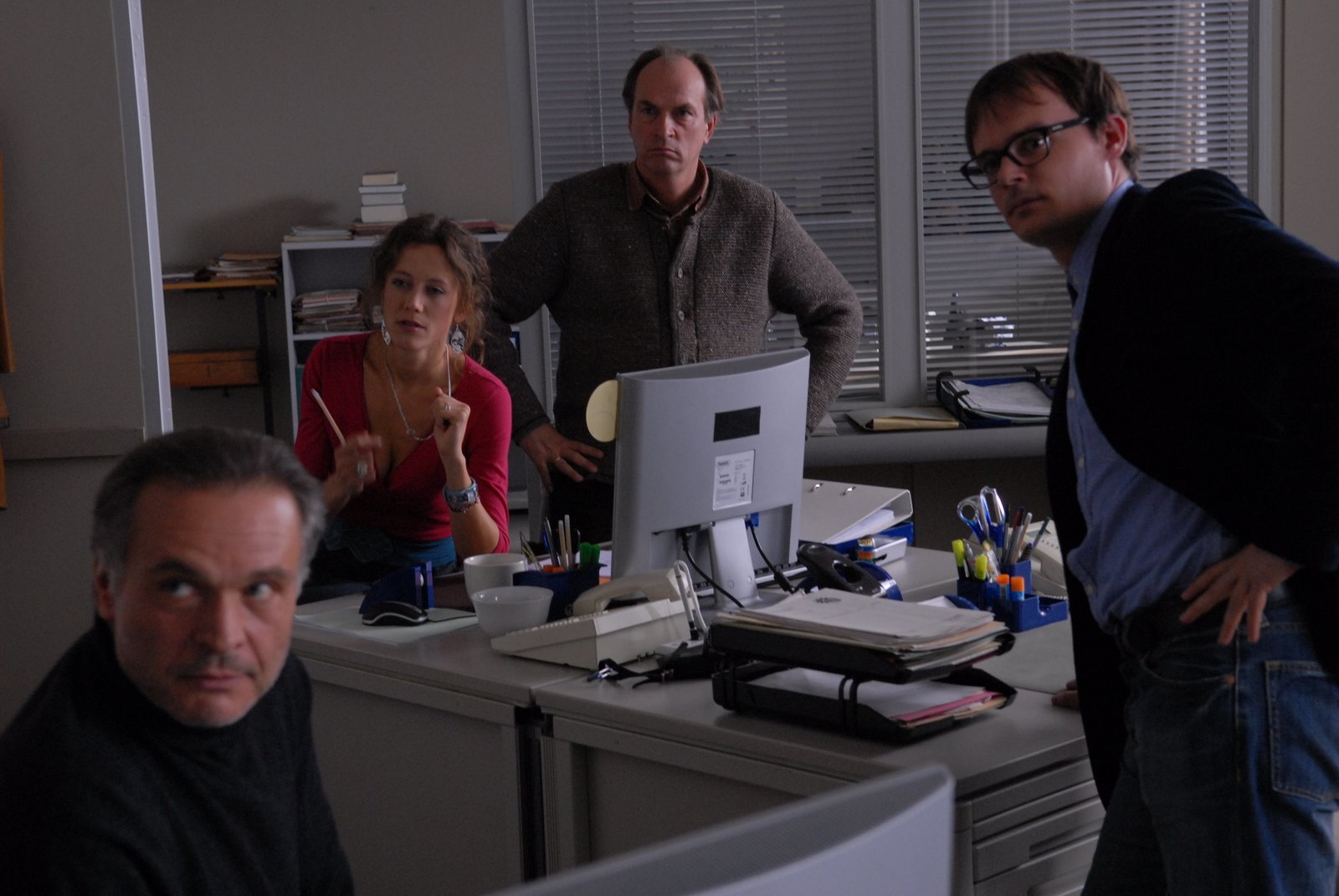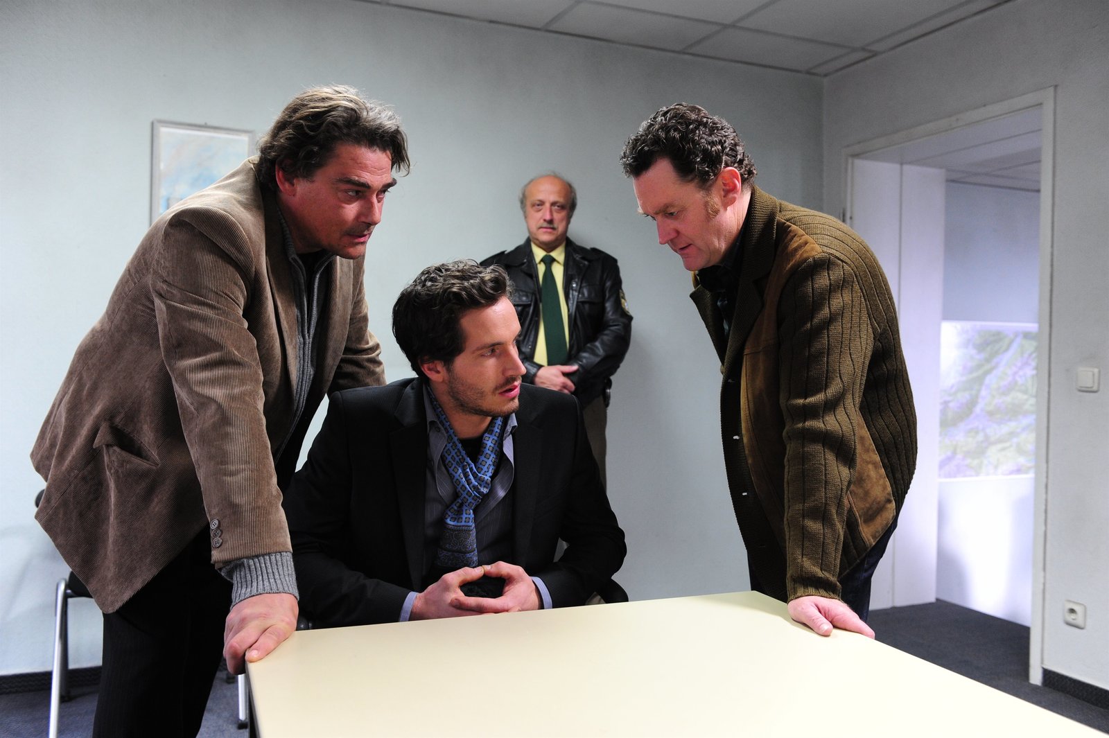 Erntedank - Ein AllgäukrimiDas Ermittlungsteam um Kommissar Kluftinger (Herbert Knaup, Mitte). Hefele (Jockel Tschiersch, links), Maier (Johannes Allmayer, rechts) und Sandy Henske (Katharina Spiering) muss sich die Ermahnungen des Dienststellenleiters Lodenbacher anhören.Bild: © S: Heimatkanal (DE) / BR/Kerstin Stelter