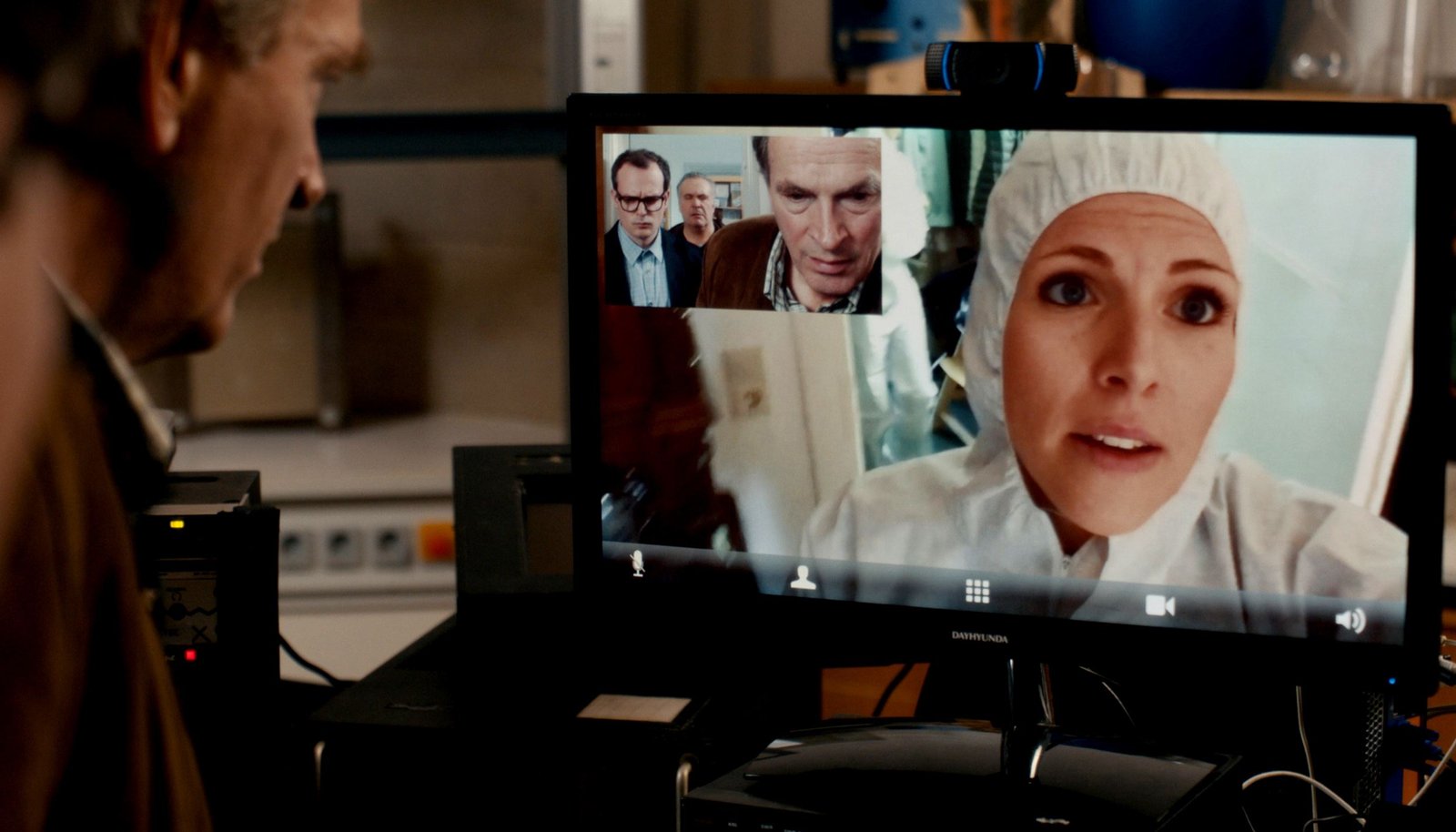 Herzblut. Ein KluftingerkrimiKluftinger (Herbert Knaup) in einer Videokonferenz mit einer Kollegin aus Augsburg (Lisa Hartenstein). Auf dem PC ebenfalls zu erkennen: Richard Maier (Johannes Allmayer) und Roland Hefele (Jockel Tschiersch).Bild: © ARD Degeto/BR/Stefan Ciupek