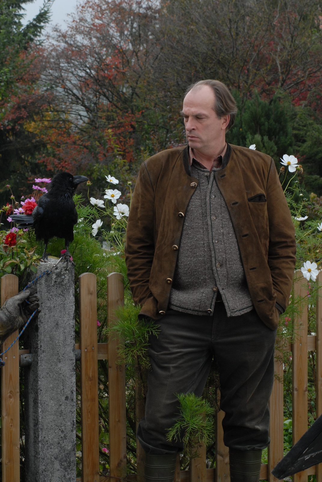 Erntedank - Ein AllgäukrimiKommissar Kluftinger (Herbert Knaup) Aug' in Aug' mit dem geheimnisvollen Raben.Bild: © S: Heimatkanal (DE) / BR/Kerstin Stelter