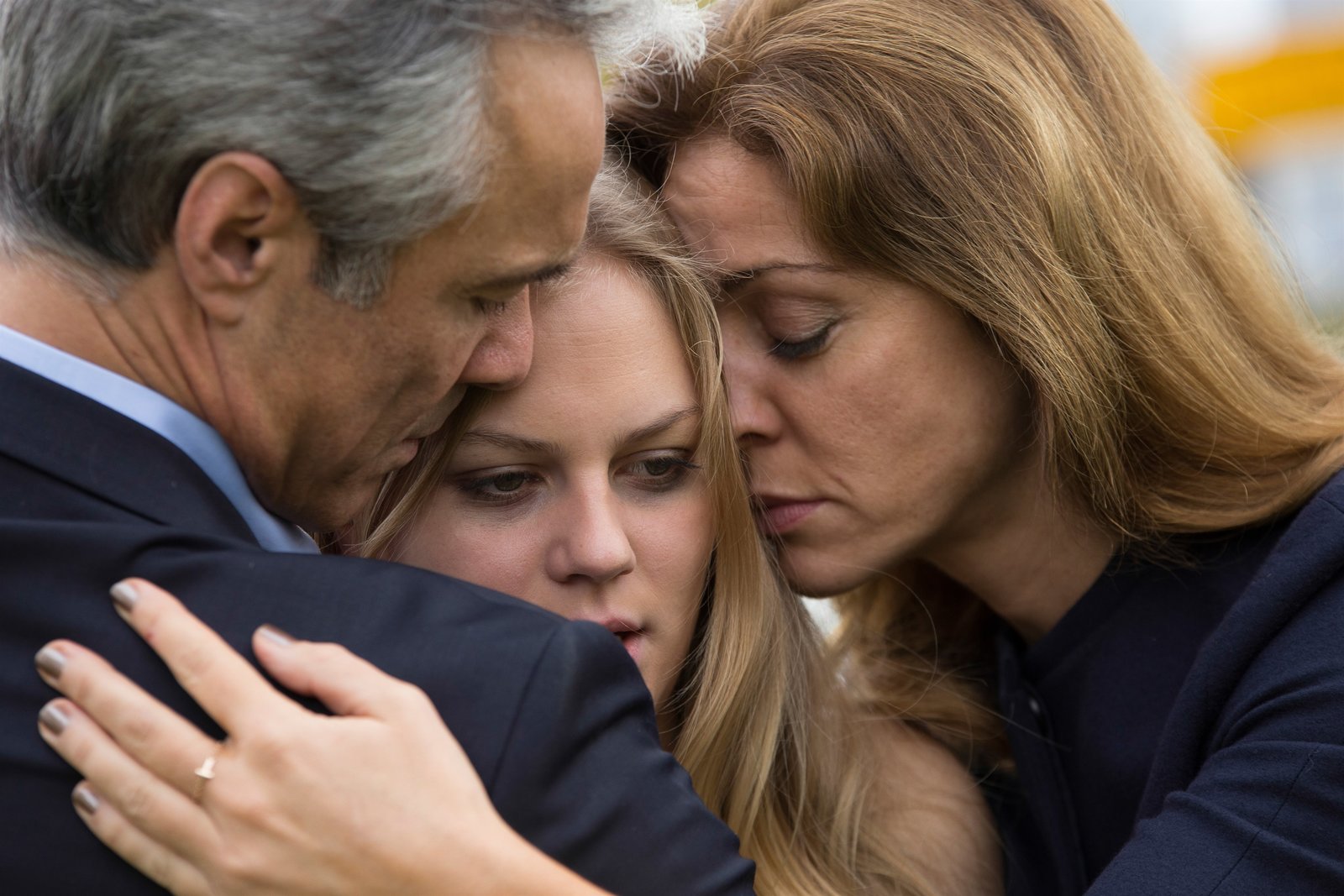 Die reichen Leichen. Ein StarnbergkrimiGerd (Hannes Jaenicke) und Rita (Ulrike C. Tscharre, rechts) sind froh, ihre Tochter Sisi (Alicia von Rittberg) unversehrt wiederzuhaben.Bild: © S: Heimatkanal (DE) / BR/Julia von Vietinghoff