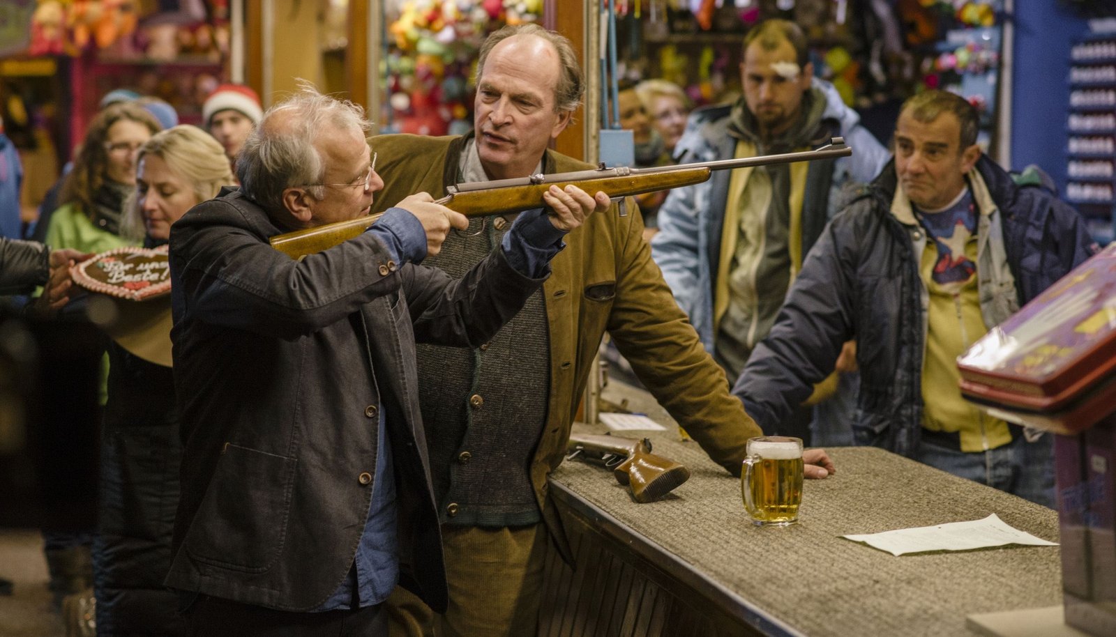 Herzblut. Ein KluftingerkrimiKluftinger (Herbert Knaup) und Langhammer (Bernhard Schütz) liefern sich ein Wettschießen. Im Hintergrund: Erika (Margarete Gilgenreiner), Burlitz (Daniel Flieger) und Herr Fink (Albert Kitzl).Bild: © ARD Degeto/BR/Hendrik Heiden