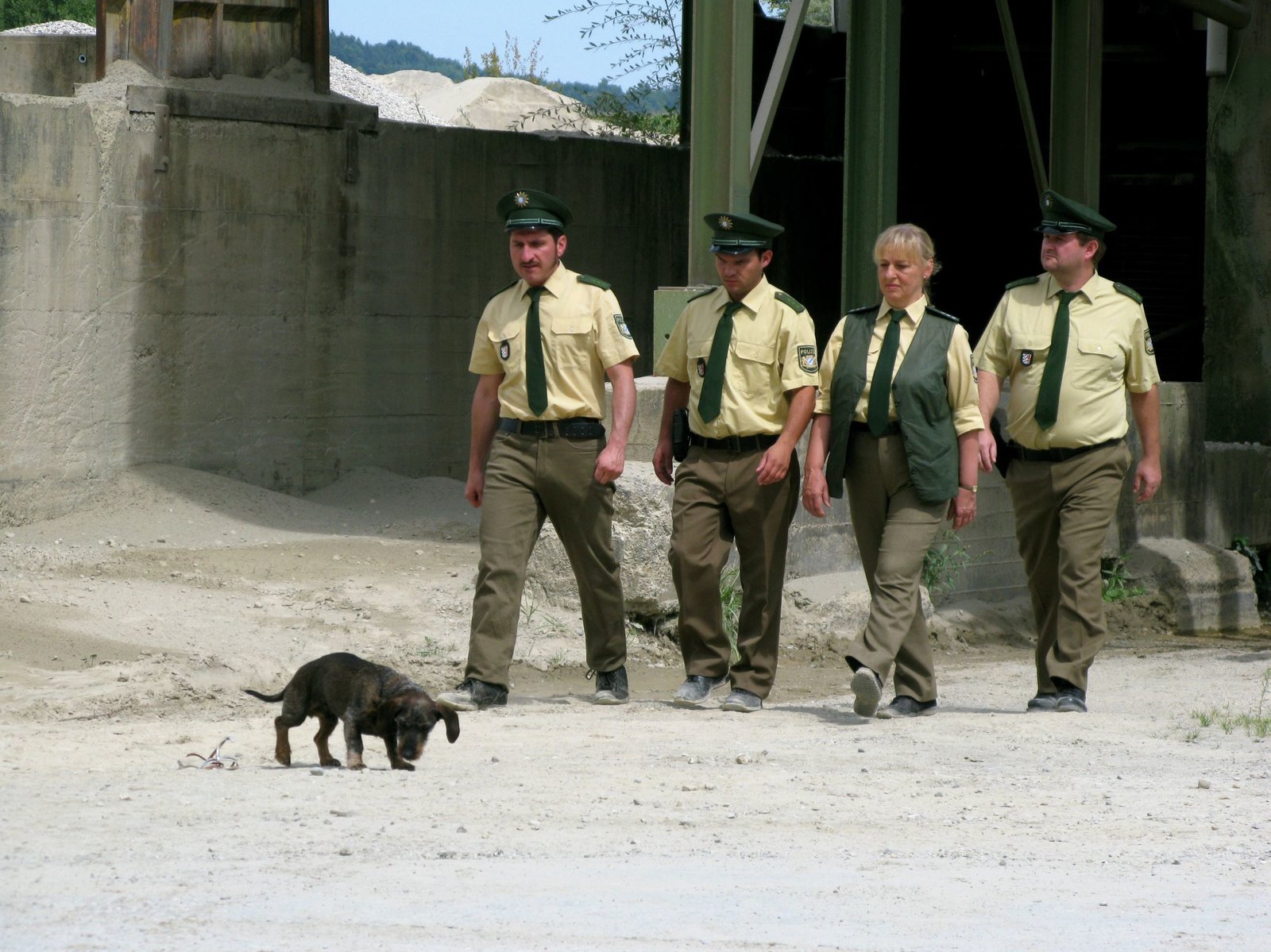 Paradies 505. Ein NiederbayernkrimiVon links: Polizist Richie (Tim Seyfi), Polizist Erwin (Moritz Katzmair), Dienststellenleiterin der Polizeistation Niedernussdorf Gisela Wegmeyer (Johanna Bittenbinder) und Polizist Schorsch (Stefan Betz) suchen im Kieswerk nach weiteren Beweisen.Bild: © BR/Christian Hartmann