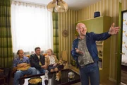 Sauerkrautkoma. Ein EberhoferkrimiDie neue Traum-WG: Rudi Birkenberger (Simon Schwarz) präsentiert Franz Eberhofer (Sebastian Bezzel, Mitte), Vater Eberhofer (Eisi Gulp, links) und Oma Eberhofer (Enzi Fuchs, rechts) seine Münchner Wohnung.Bild: © BR/Constantin Film/Bernd Schuller