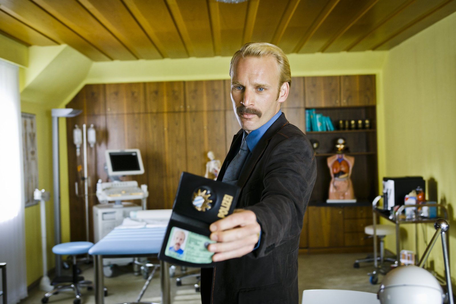 Paradies 505. Ein NiederbayernkrimiPolizeihauptkommisar Florian Lederer (Florian Karlheim) zeigt seine Marke der Sprechstundenhilfe von Dr. Huber.Bild: © S: Heimatkanal (DE) / BR/Christian Hartmann
