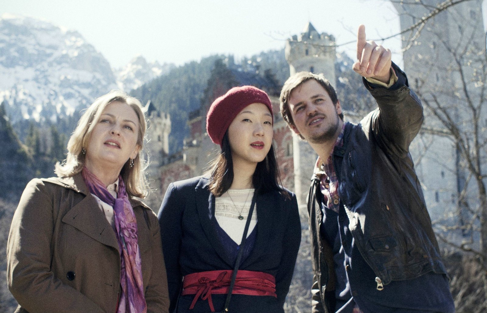 Seegrund. Ein KluftingerkrimiErika Kluftinger (Margret Gilgenreiner, links) besucht mit ihrem Sohn Markus (Frederic Linkemann) und dessen japanischer Freundin Yumiko (Joy Maria Bai) Neuschwanstein.Bild: © MDR/Degeto/BR/Hagen Keller