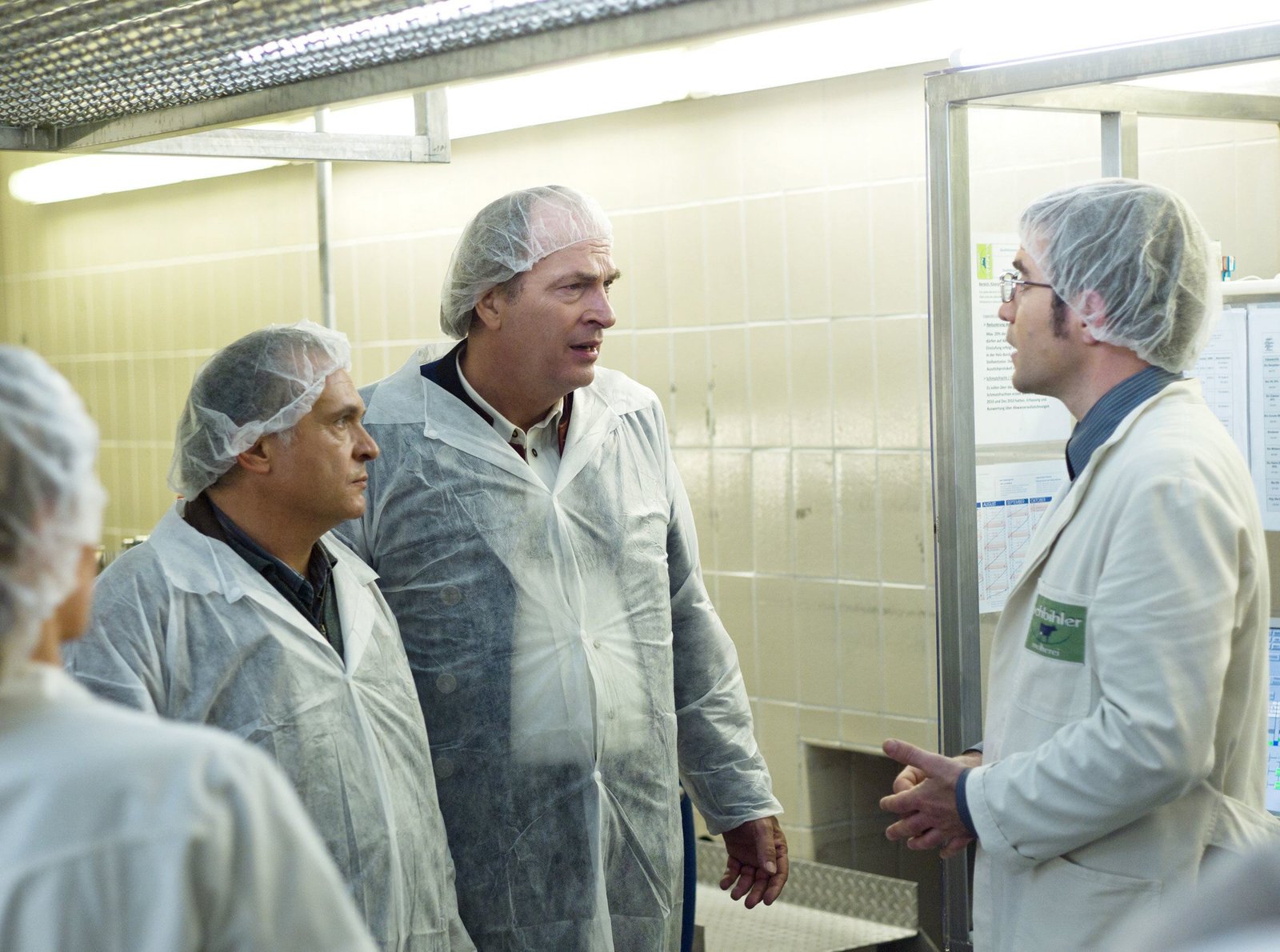 Milchgeld - Ein KluftingerkrimiKommissar Kluftinger (Herbert Knaup, 2. von rechts) besucht mit dem Kollegen Roland Hefele (Jockel Tschiersch, 2. von links) die Molkerei und befragt Robert Bartsch (Urs Fabian Winiger, rechts).Bild: © "ARD Degeto/BR/Hagen Keller" (S 2)