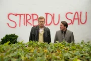 Dampfnudelblues. Ein EberhoferkrimiNach einer bedrohlichen Wandschmiererei bittet Schuldirektor Höpfl (Robert Palfrader, rechts) Polizeihauptmeister Franz Eberhofer (Sebastian Bezzel) um Hilfe.Bild: © "ARD Degeto/ARD Degeto/BR/Bernd Schuller" (S2)