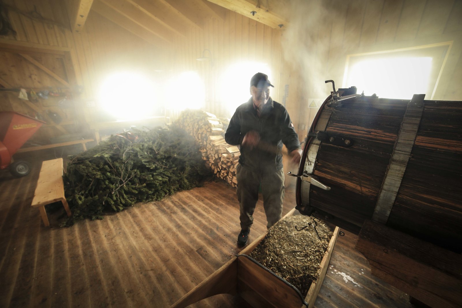 Winterglück - Eine Liebeserklärung an Schnee und EisBrenner Franz Luidold brennt und destilliert seit vielen Jahrzehnten das wertvolle Latschenkiefernöl.Bild: © Wick-Media / ServusTV / Wick-Media / ServusTV / Wick-Media