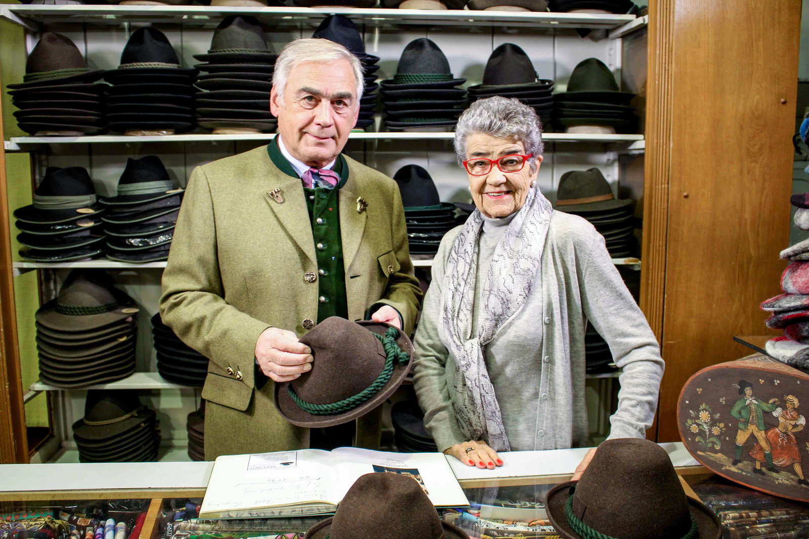 WinterfreudenBertl Göttl mit Cumberland Hut und Seniorchefin Ingrid Helmich von Haas Hüte.Bild: © Servus TV
