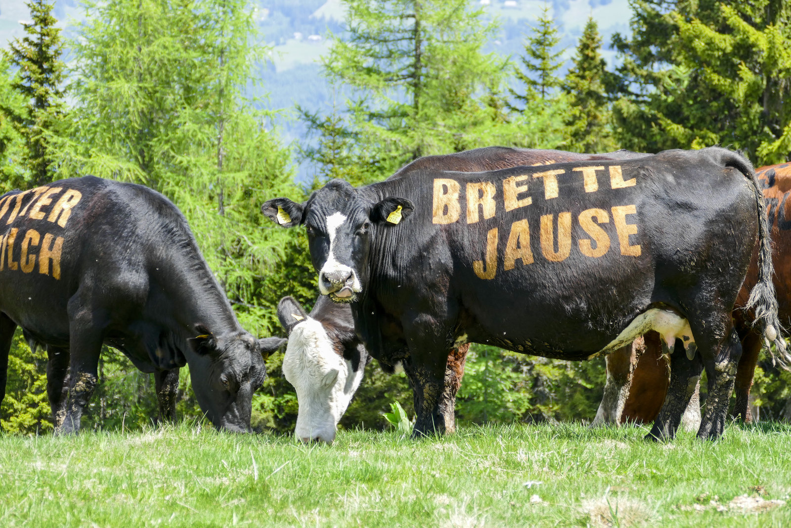Österreich - kurios, dubios, grandios (1)Vor 14 Jahren hatte ein Almwirt die eigensinnige Idee, seine Kühe mit riesengroßen Lettern zu Beschriften, welche sozusagen die "lebende Speisekarte" seines Almgasthofes veranschaulichen.Bild: © ServusTV