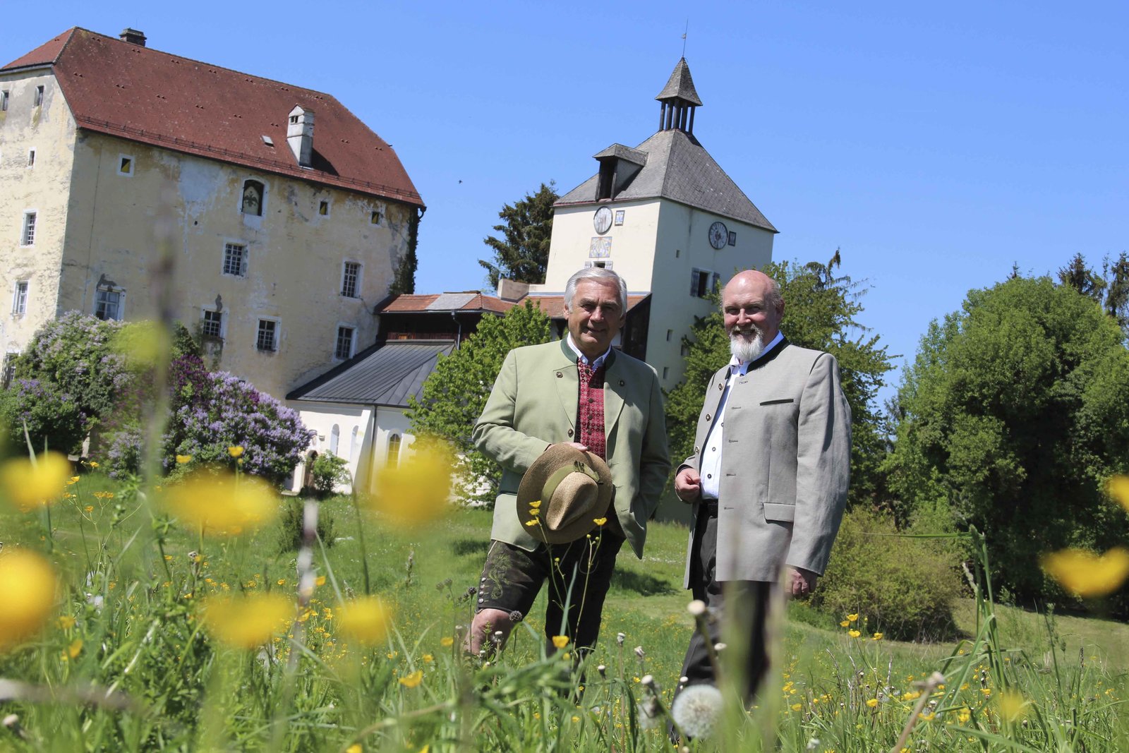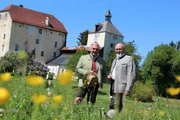 Mit Bertl Göttl im RupertiwinkelBertl Göttl und Rudolf Graf Logothetti (rechts) vor Schloss Triebenbach bei Laufen, BayernBild: © ServusTV / Erhart