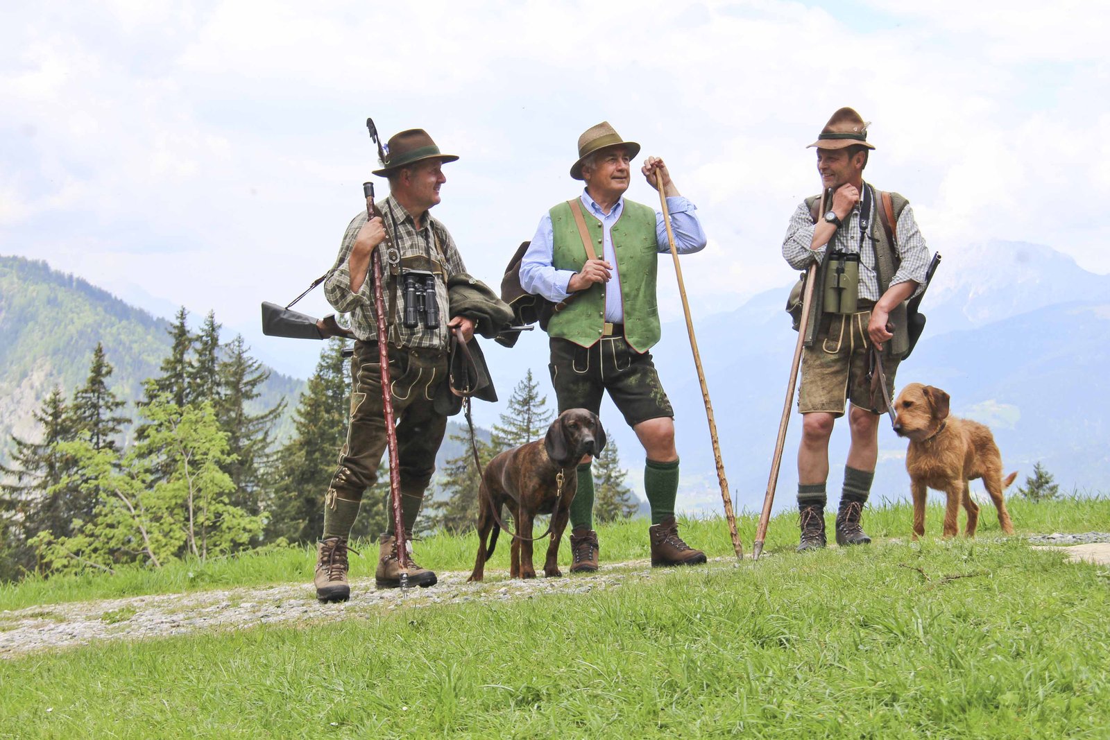 Sommer-Special: Bertl Göttls ReiseträumeThe hunter Kurt Zollner, Bertl Goettl and the hunter Josef Schwarzenbacher seniortogether with two dogs on the Egger Alm bei Hermagor, Austria, during ServusTV's Unterwegs mit Bertl Goettl - Im Kaerntner Dreilaendereck.Bild: © ServusTV