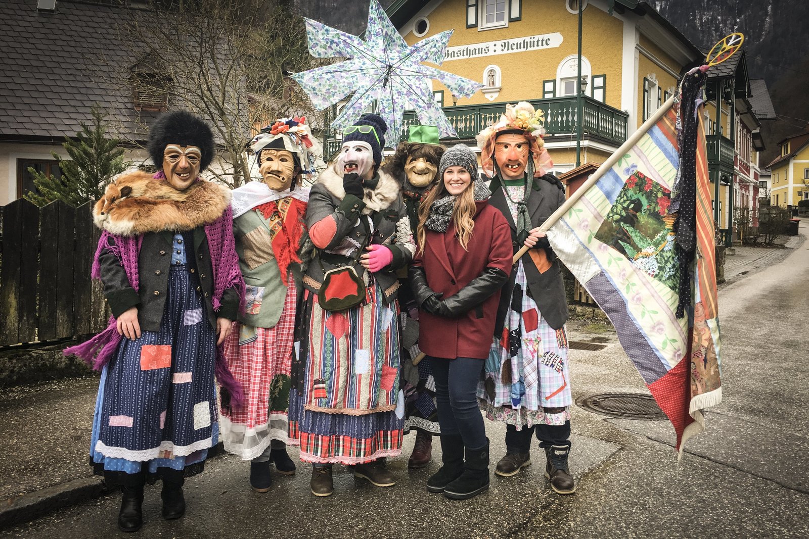Fetzen und Flinserl - Fasching in ÖsterreichServusTV Moderatorin Conny Bürgler zusammen mit verkleideten Teilnehmern des traditionellen Ebenseer Fetzenzuges in Ebensee.Bild: © Servus TV / Ethan Vincent