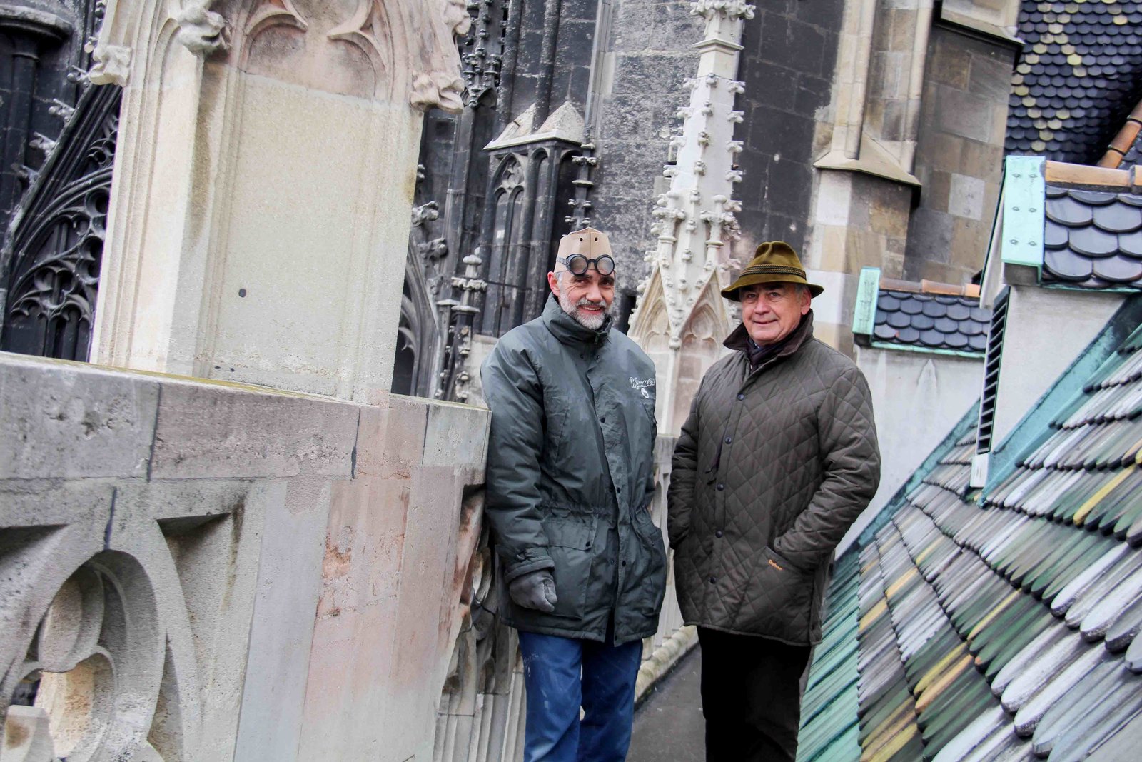 Mit Bertl Göttl in WienBertl Göttl mit dem Steinmetzmeister der Dombauhütte, Philipp Stasny (links) am Dach des Stephansdoms, WienBild: © ServusTV