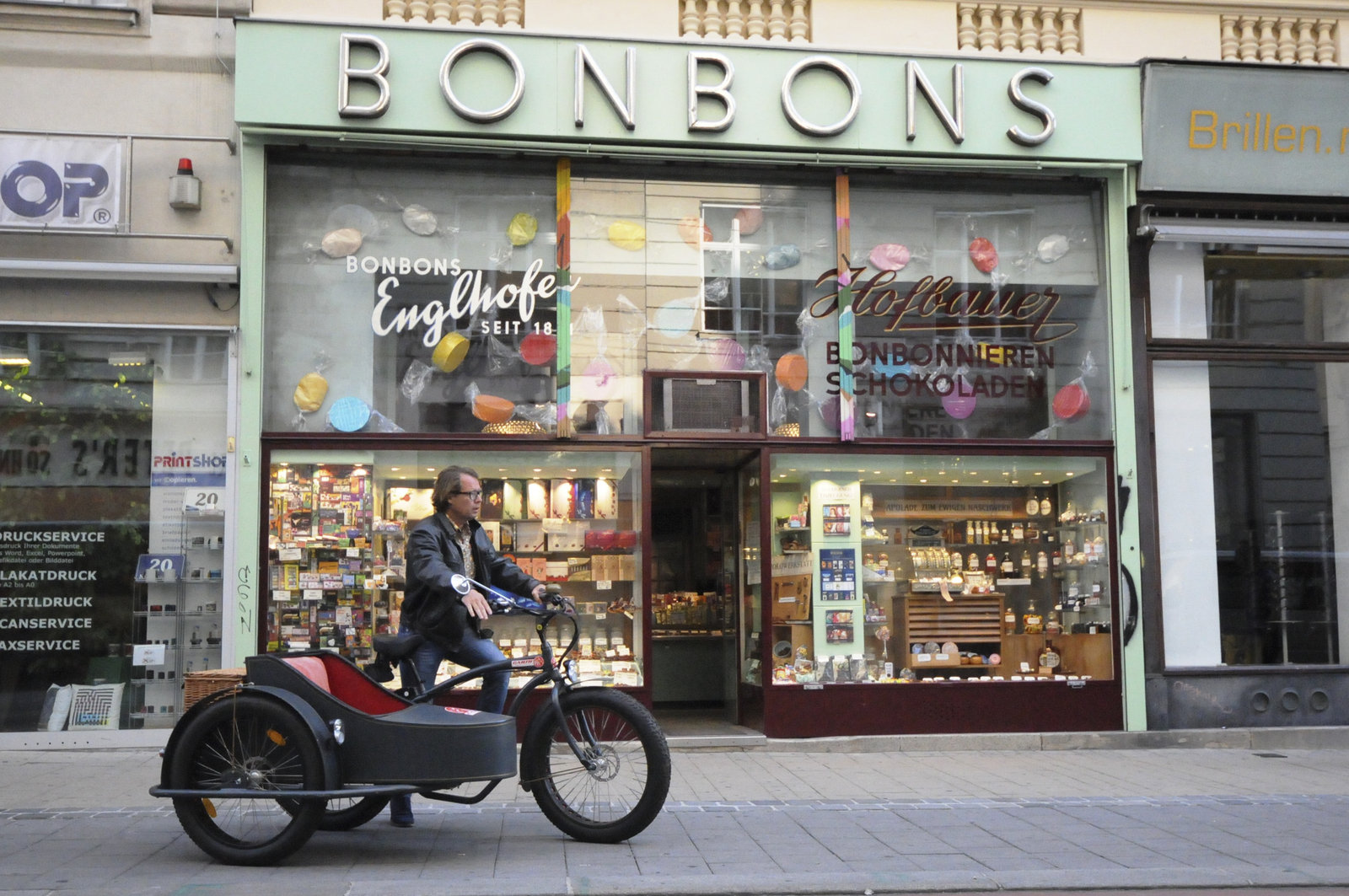 Alte Liebe rostet nichtRoland David mit EBike vor dem Geschaeft Bonbons in Wien, Oesterreich fuer ServusTV's "Heimatleuchten - Alte Liebe rostet nicht".Bild: © ServusTV
