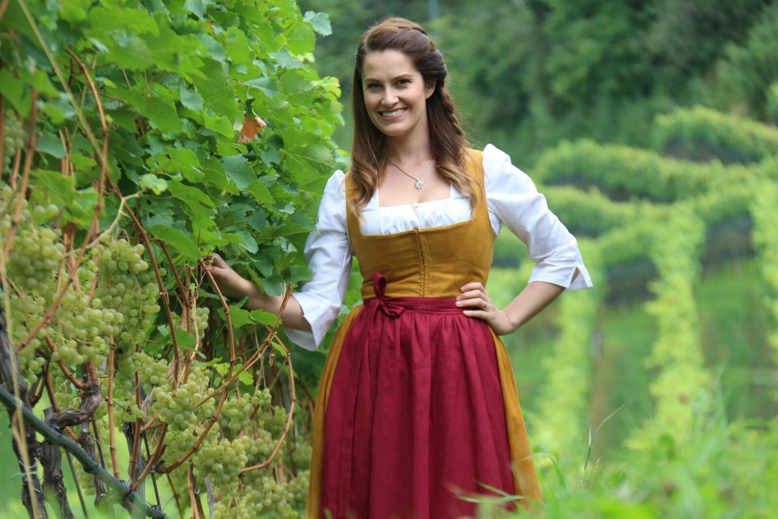 Steil, stolz, Stilfs - Mit Conny Bürgler am StilfserjochModeratorin Conny Buergler unterwegs in den Weinbergen in Stilfs, Vinschgau, SüdtirolBild: © ServusTV / DegnFilm / Brigitte Erhart