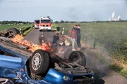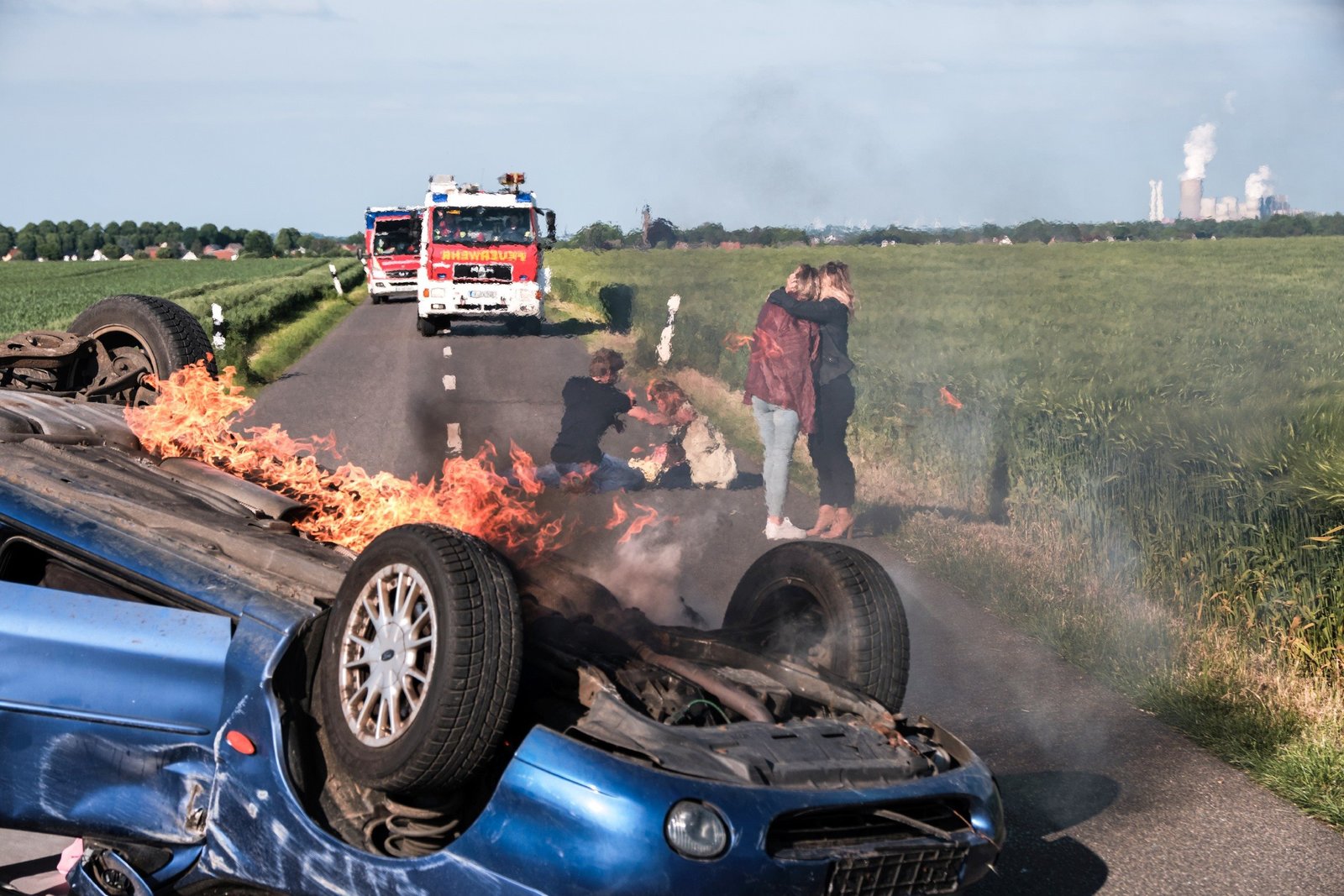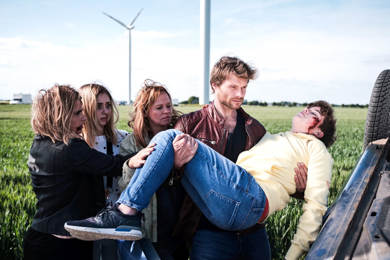 Der Retter in der NotKathi Bender (Mandy Neidig) und ihre Familie erleiden einen schweren Autounfall. Sonja Richter (Sarah Mangione, r.), Kai Bender (Alexander Vukomanovic, liegend), Marie Bender(Sarah Buchholzer, 2.v.r.). Robert Gerlach (Felix Maximilian, l.) taucht wie aus dem Nichts auf und rettet die Familie.Bild: © TVNOW / Stefan Behrens